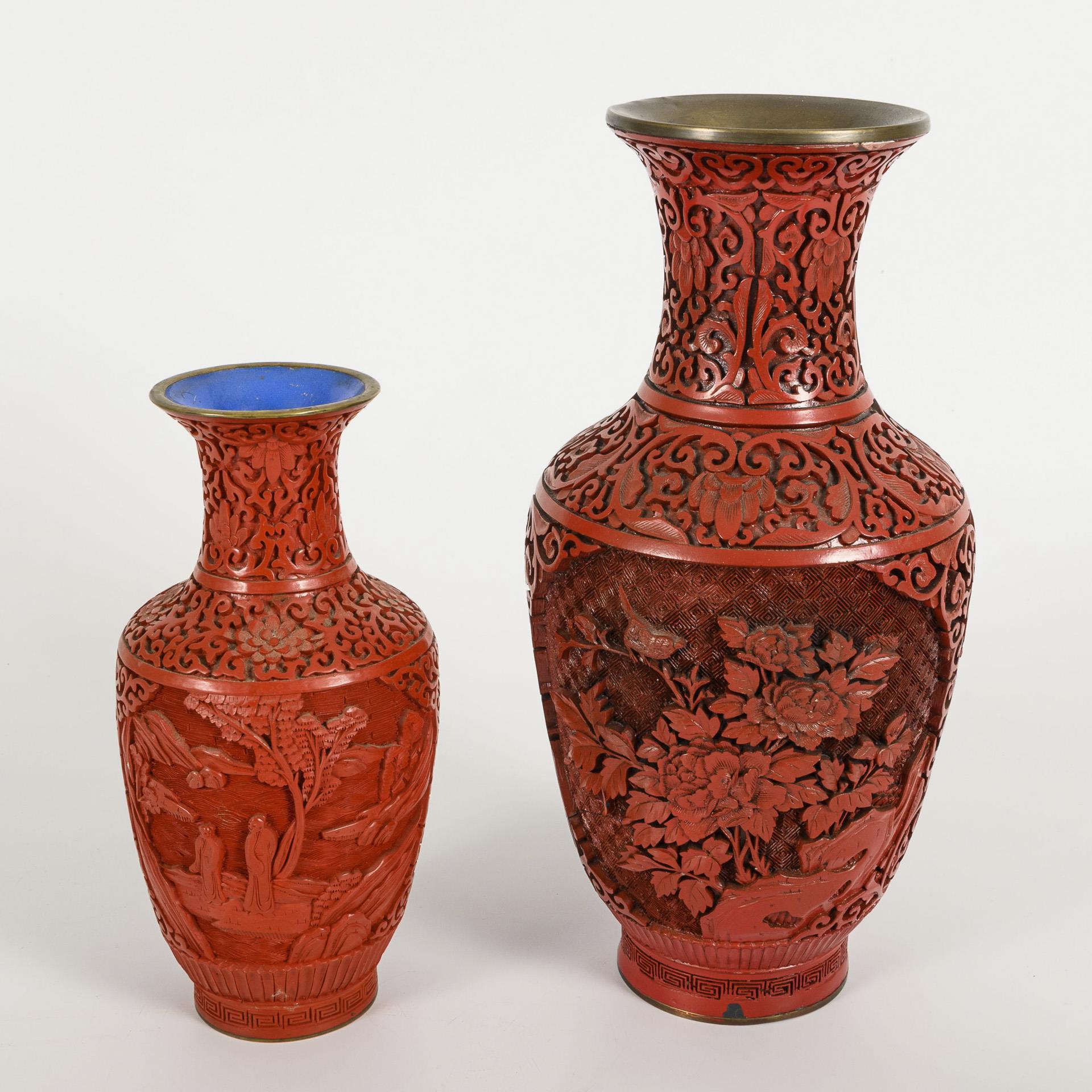 All with brass body, the three small vases with blue enamel interior. Red lacquer in deep relief with depictions of plants and landscapes. Large vase with dry cracks and missing part.