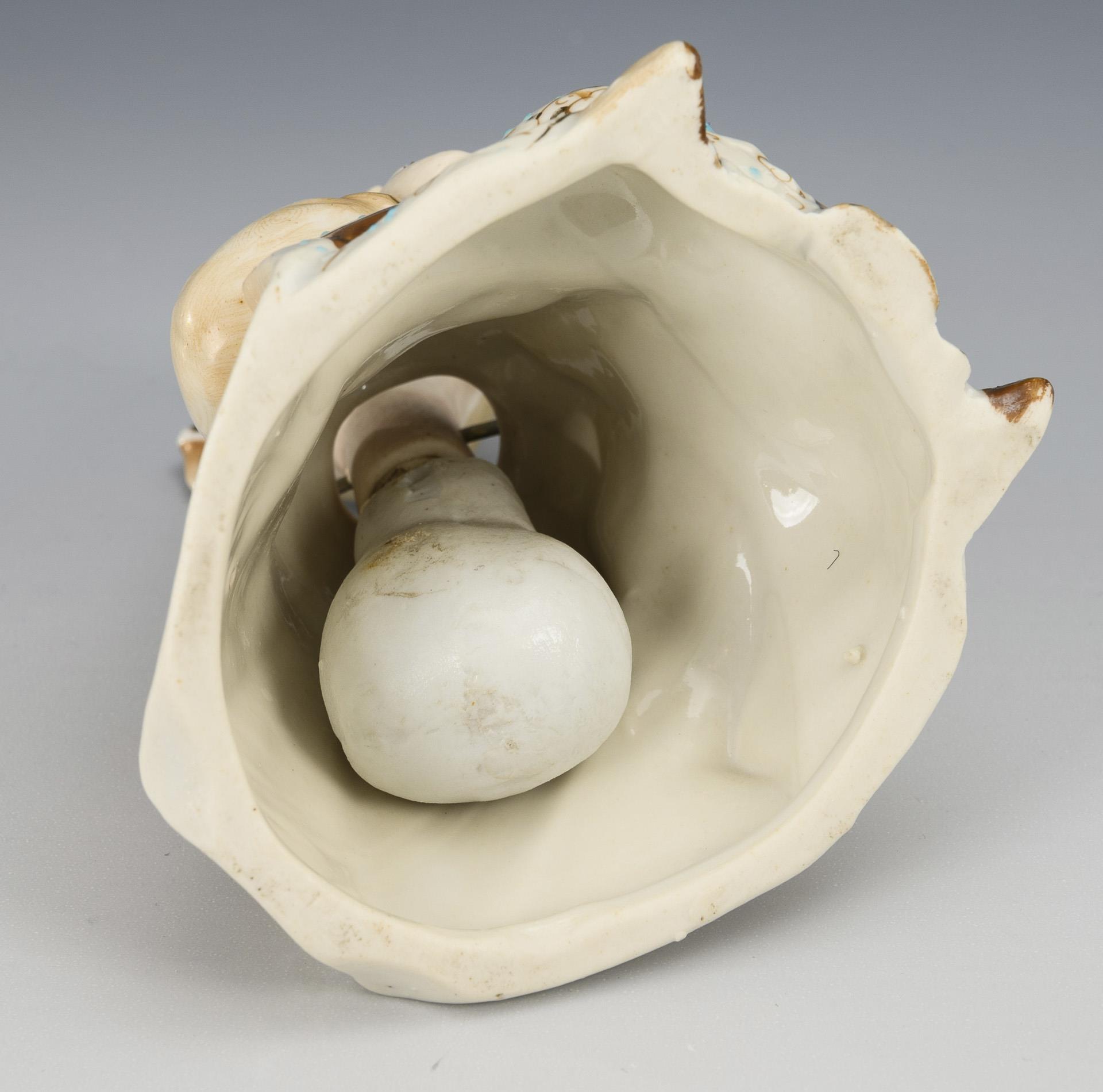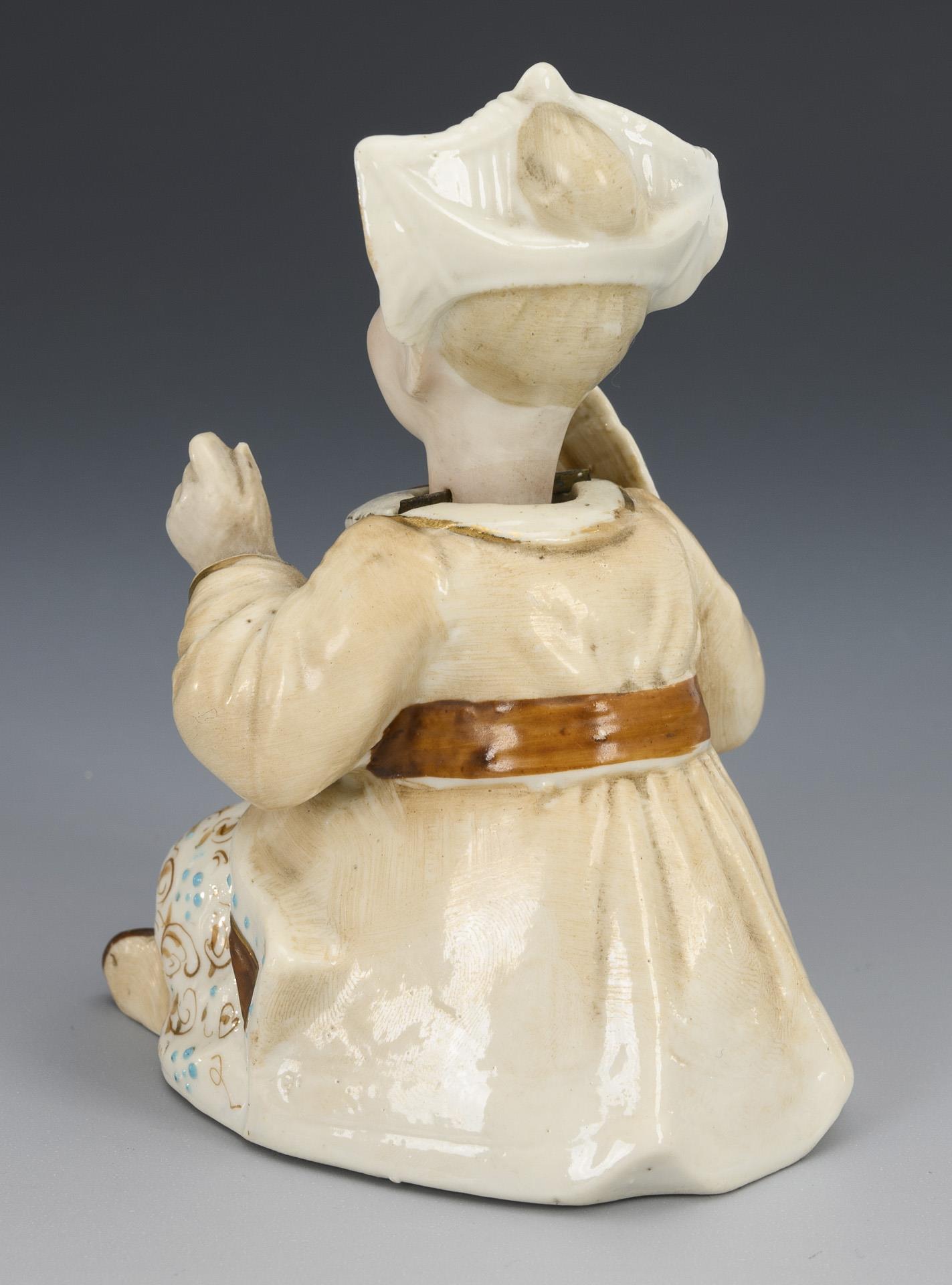 Medieval girl sitting cross-legged with wobbling head. Left shoe tip minimally bumped.