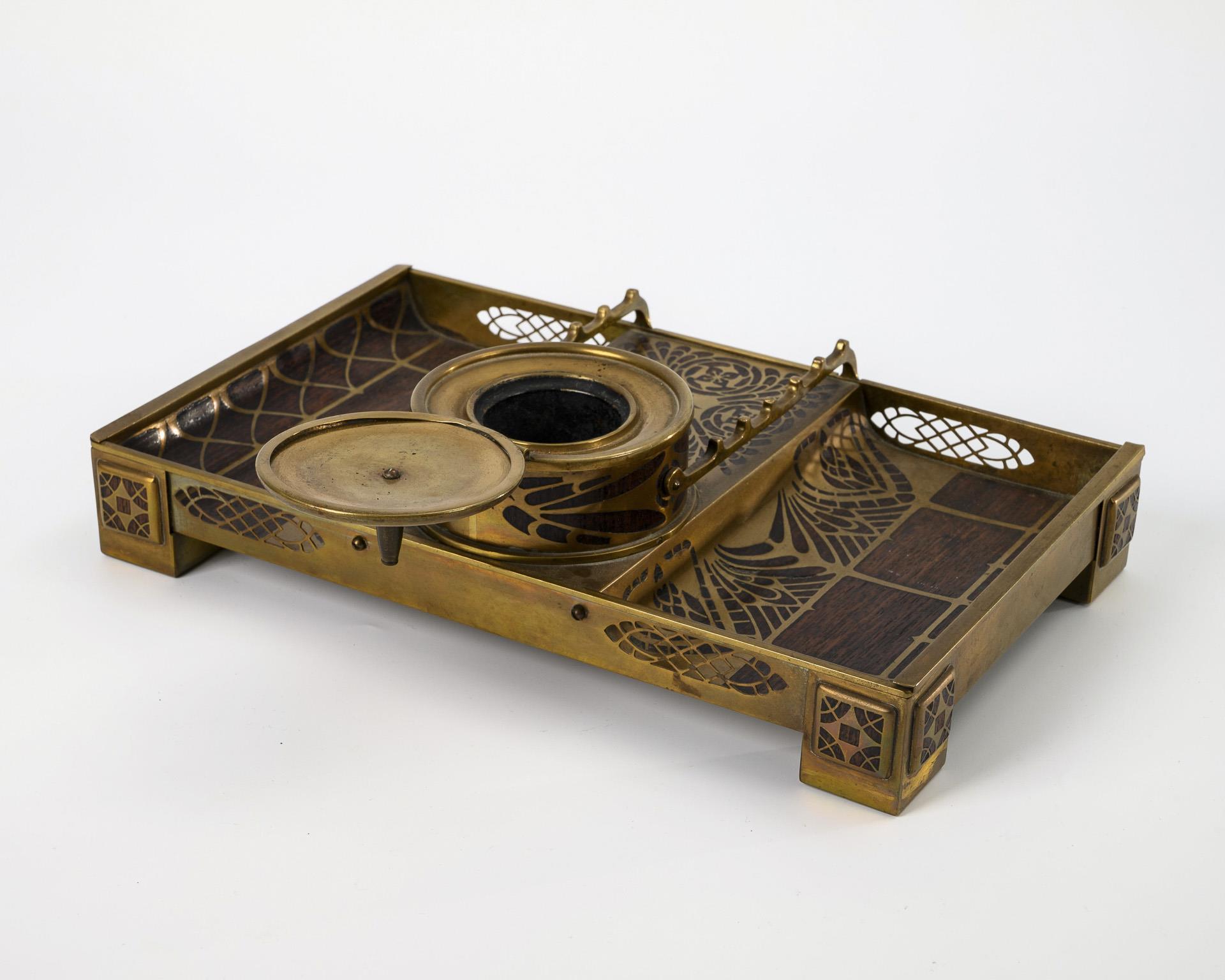 Richly ornamentally decorated writing utensil with central box as inkwell on the raised central field as well as lateral pen trays. Minor missing parts, otherwise minor signs of age/use.