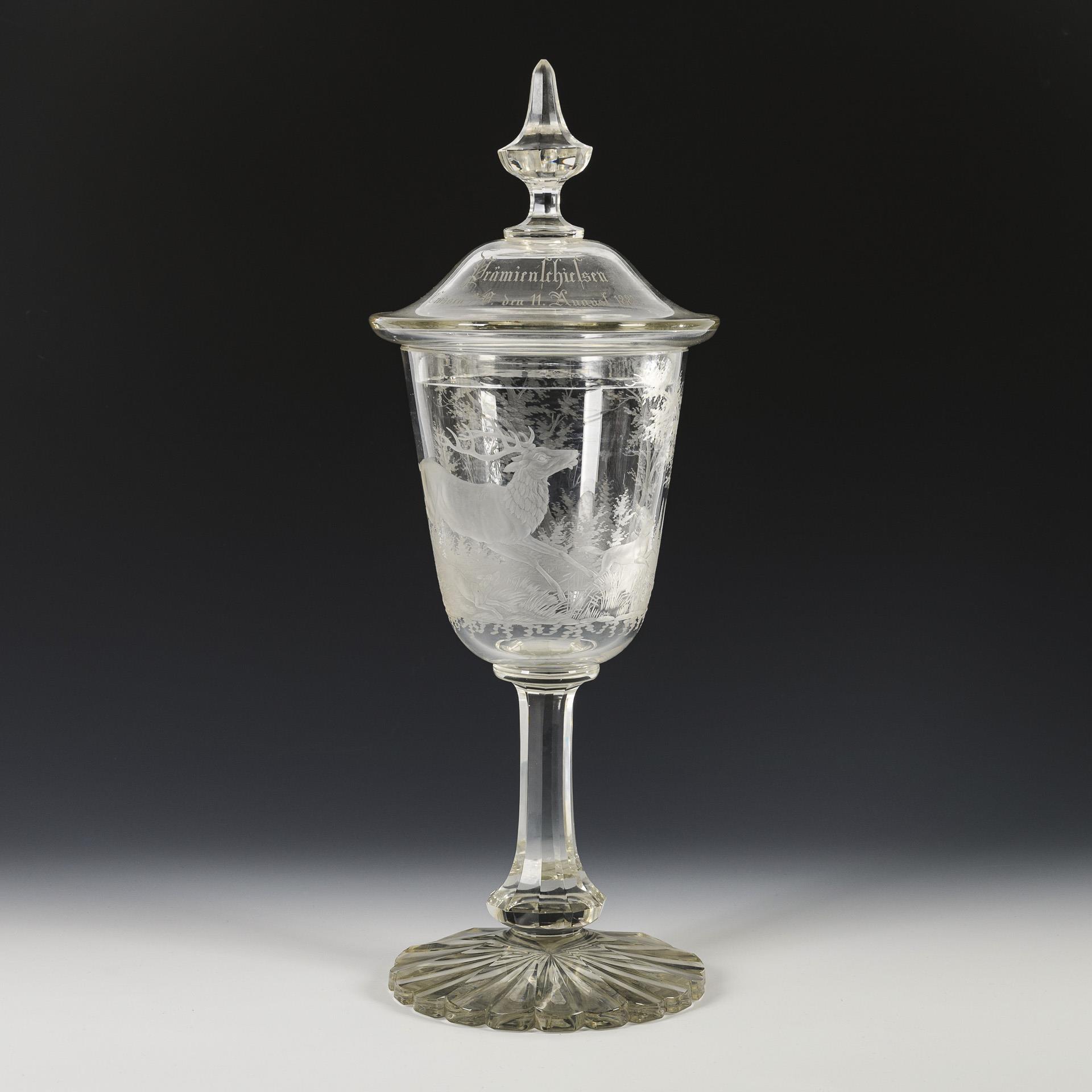 Conical bowl, knobbed lid, faceted stem, multi-pass foot. Engraved depiction of a forest landscape with a pack of hounds chasing a stag all around the bowl. On the lid the inscription "Prämienschiessen Crossen a/D. den 22. August 1883.".