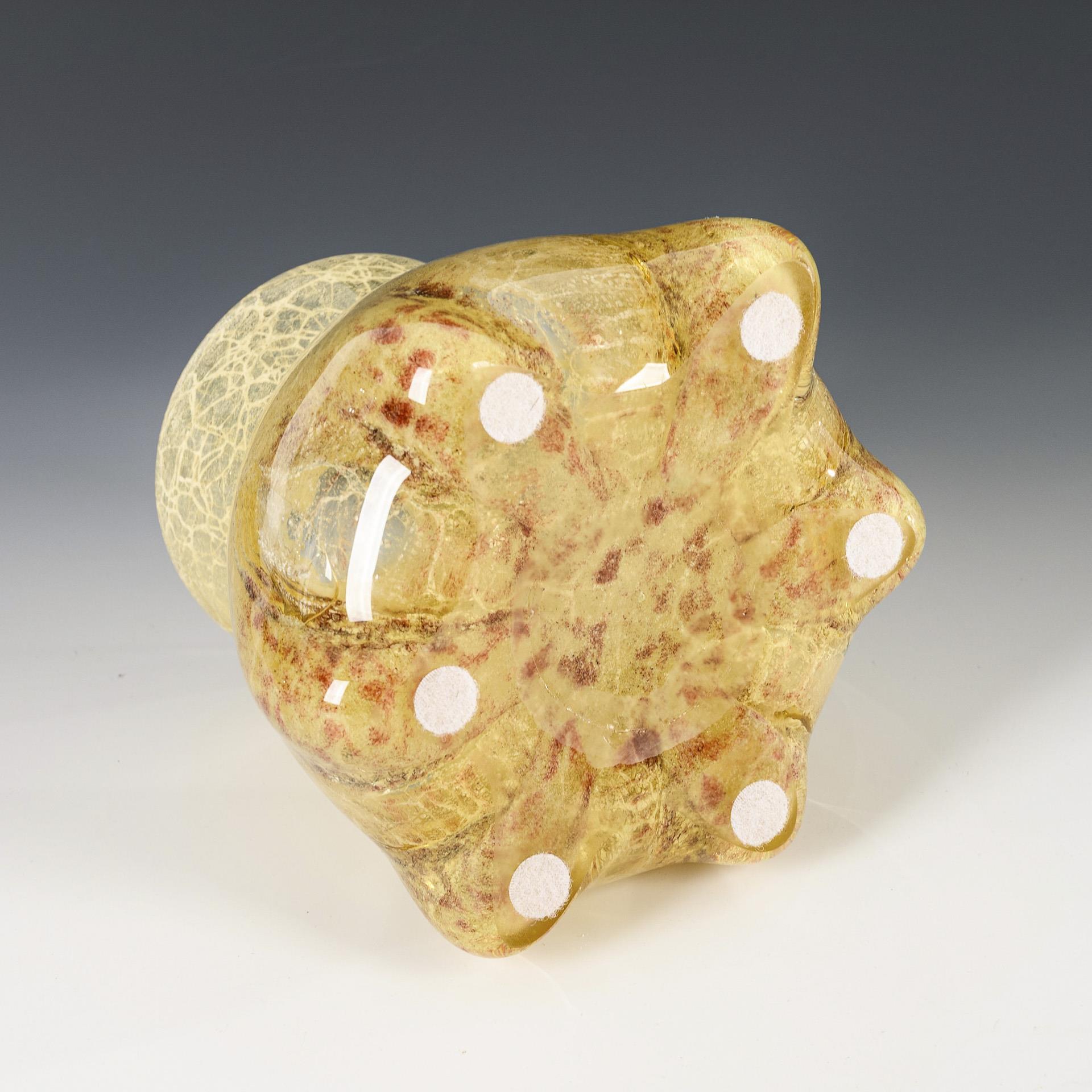 1x vase, so-called "elephant foot": Bellied body with constricted neck, widened mouth and six bulges on the stand. Colourless glass with light yellowish underlay and reddish-brown and white powder in the intermediate layer, torn into a net. / 1x funnel vase made of colourless glass with green overlaid round foot and opal white-green intermediate layer with brown powder net and yellow and green powder fusions. "Elephant's foot" vase with large, enclosed air bubble.