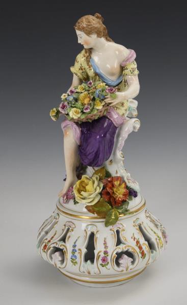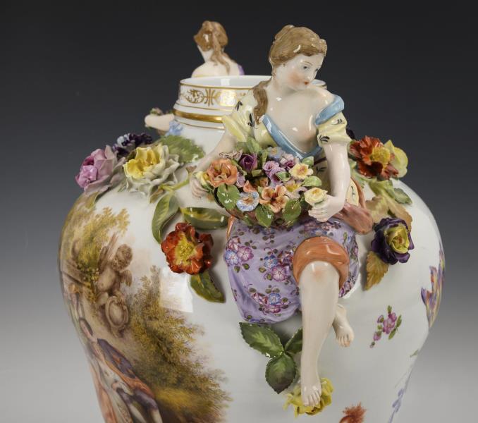 Flower-covered baluster vase with two female figures holding a flower basket as handles and openwork lid with female figure, four-footed, flower-covered base. A Watteau scene on the front of the vase and base, a bouquet of flowers on the reverse. Bumps and restorations to the covering, right arm of the lid figure, legs of a vase figure and arms of a vase figure restored.