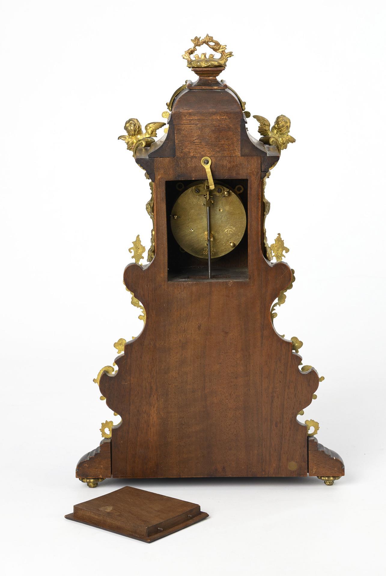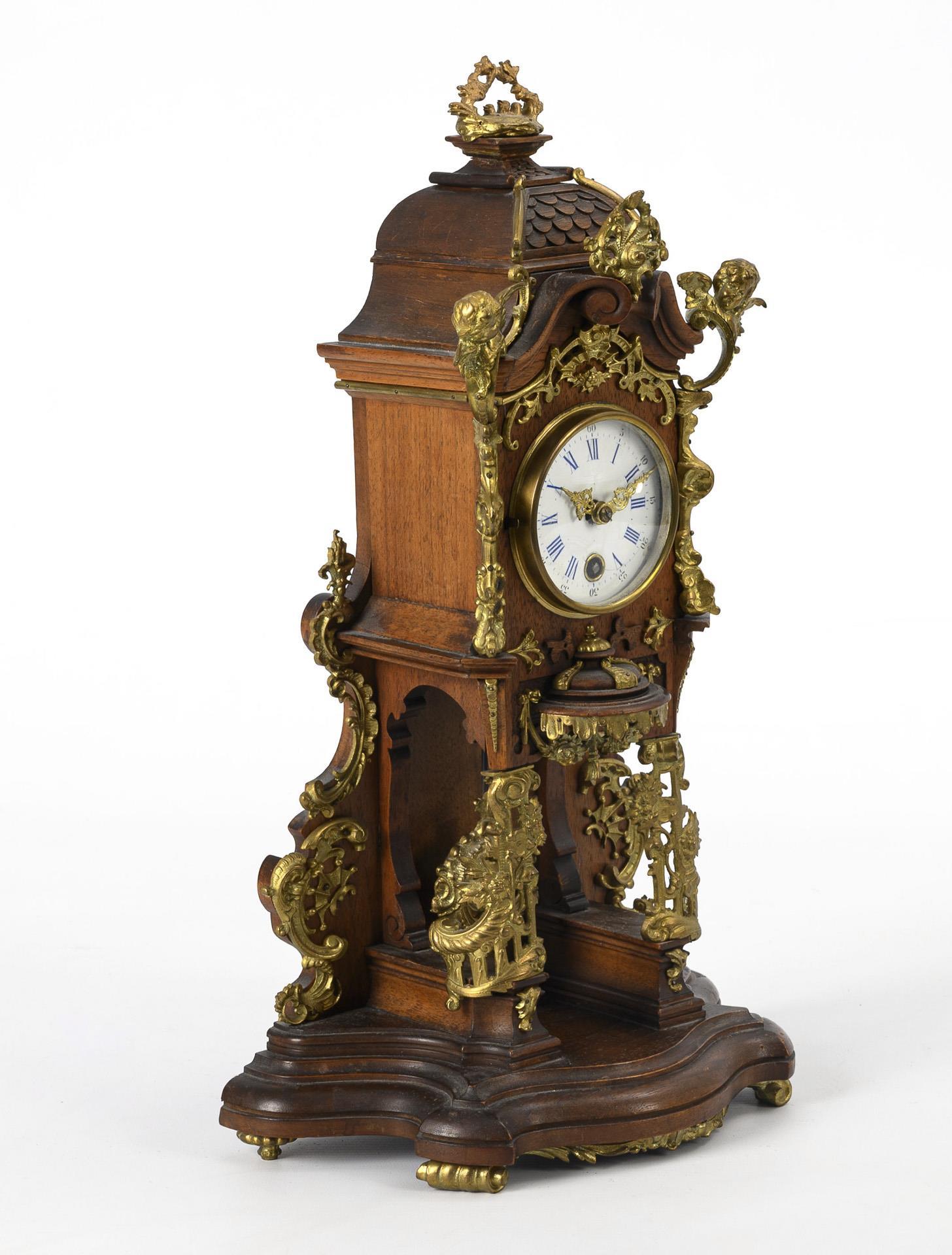 Rococo-style Wilhelminian-style table clock with architectural case, wide curved base, free-swinging pendulum and hipped roof with crowning bird's nest (stork missing). Richly decorated with foliage, rocailles and winged putti. Crowning with replaced, bronzed metal casting, dial with defects.