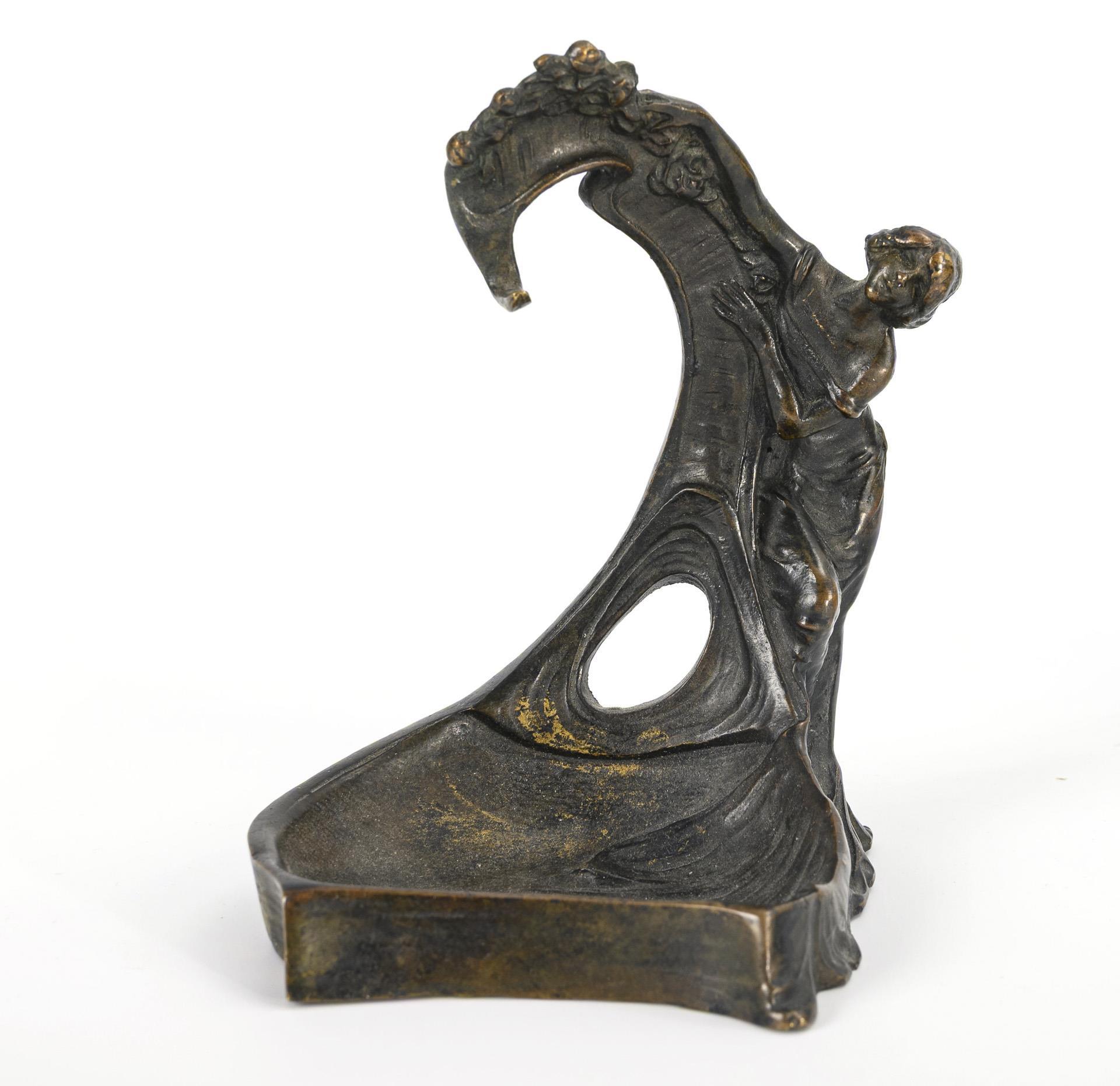 Pocket watch holder in typical stylistic language with flowing ribbons and floral elements, partly with storage tray, 2x with female figures, 1x with stand. In addition, 1 pocket watch with burnished iron case and white dial with Roman and Arabic numerals, small second and Fantaisie hands, unmarked movement with lever escapement and crown winding, functional in the short time test. Signs of age and wear.