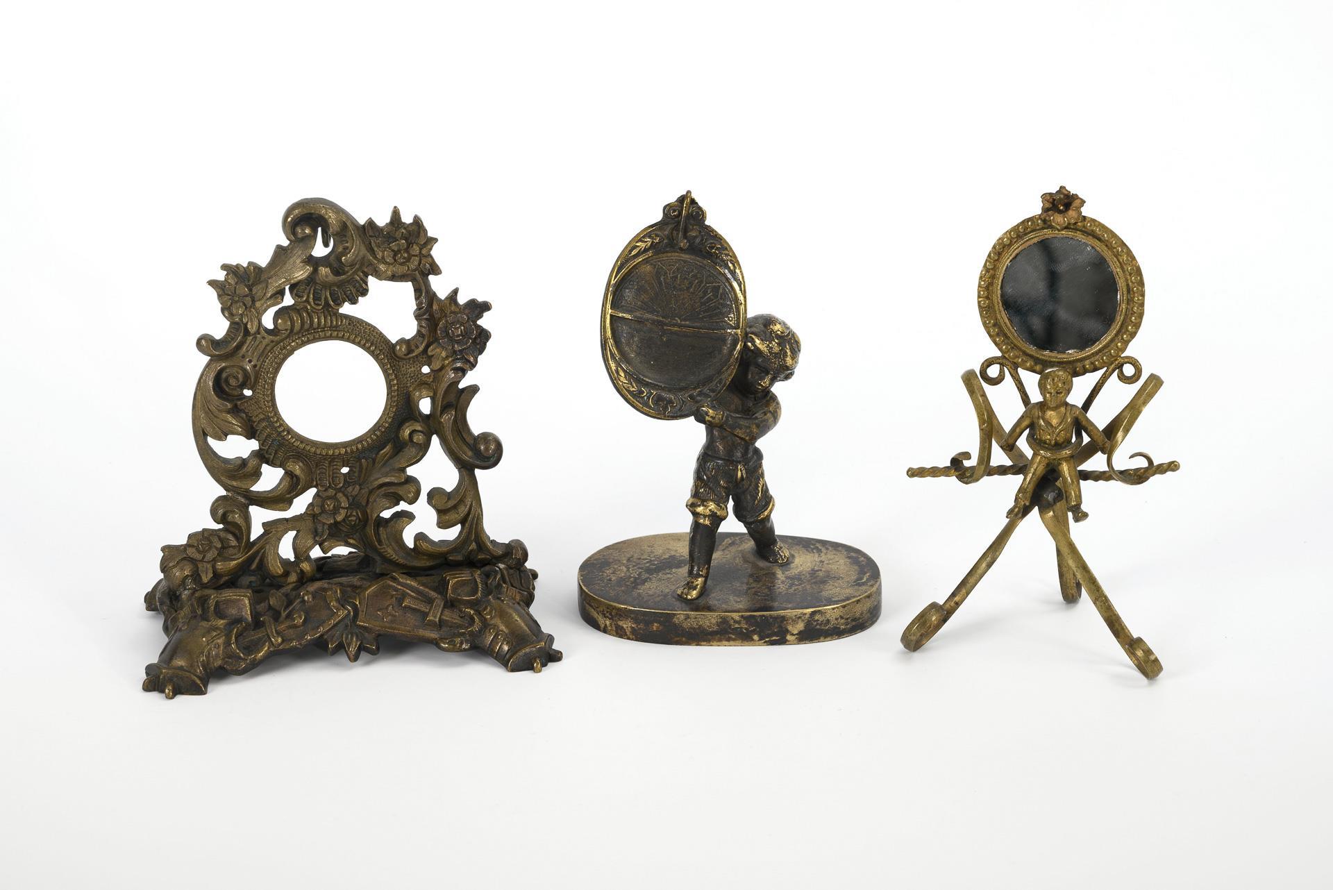 Bronze and cast metal. H max. 24 cm, clocks Ø 3.3 cm and 5.2 cm. Stand 1.5 kg, clocks 157 g.