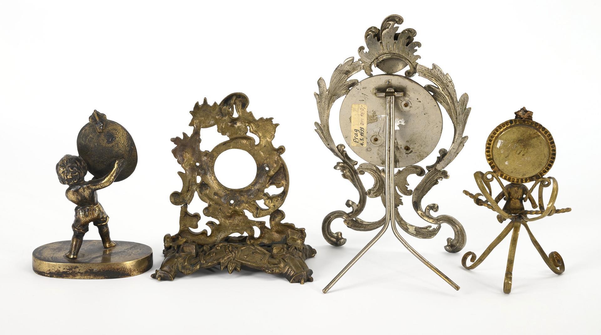Various historicist decorations, including Art Nouveau and Rococo, 2x with children's figures, 1x with stand. Including 1 silver ladies' pocket watch with cylinder escapement and 1 English pocket watch with lever escapement and key winding, without key, hallmarked walking lion/city mark Chester and London/year letter M (1895)/master's mark J.B., engraved "W[illia]m McCririck". Both watches functional in the short-term test. Signs of age and wear, partly with defects.