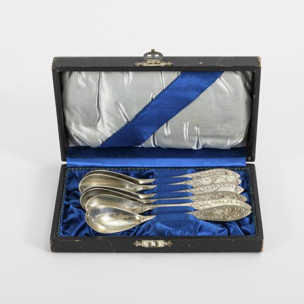 6 Biedermeier ice cream spoons in brown case.