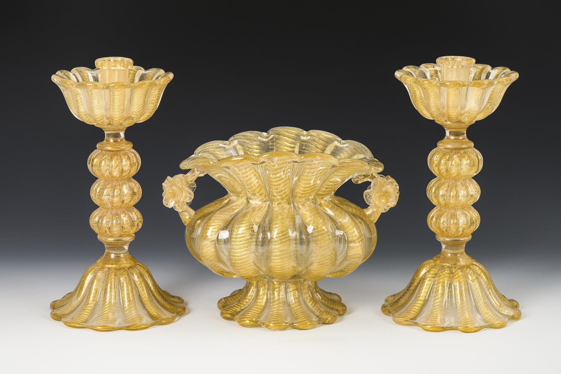3-piece table set: pair of candlesticks and jardiniere. Barovier & Toso.