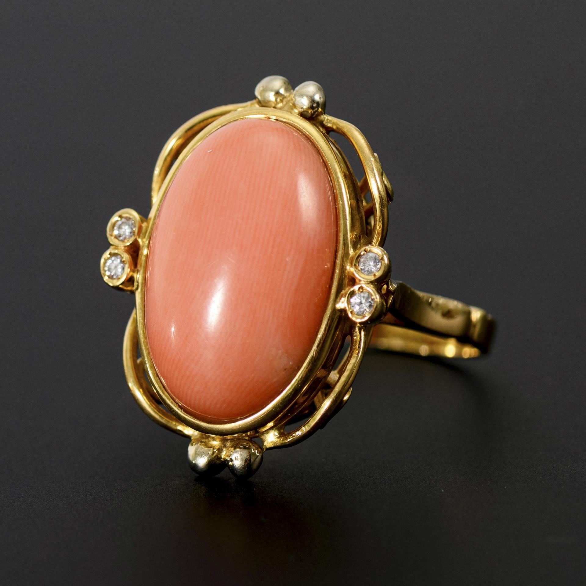 Ring with large coral cabochon and brilliant-cut diamonds.