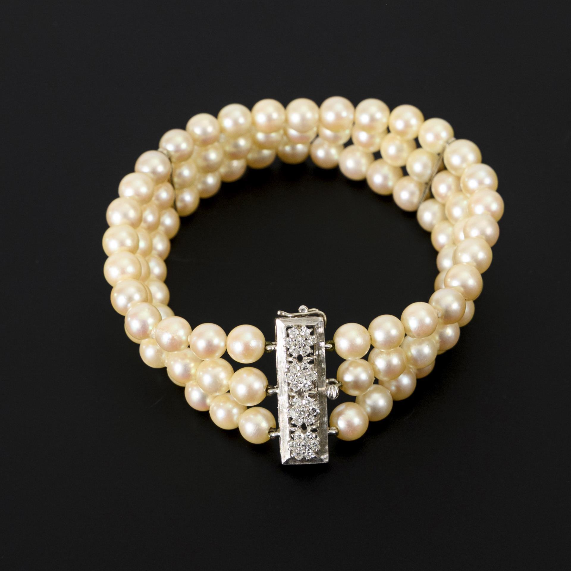 Three-row bracelet of Akoya cultured pearls with a box lock, this decorated with a setting of 28 single-cut diamonds arranged into 4 small blossoms.