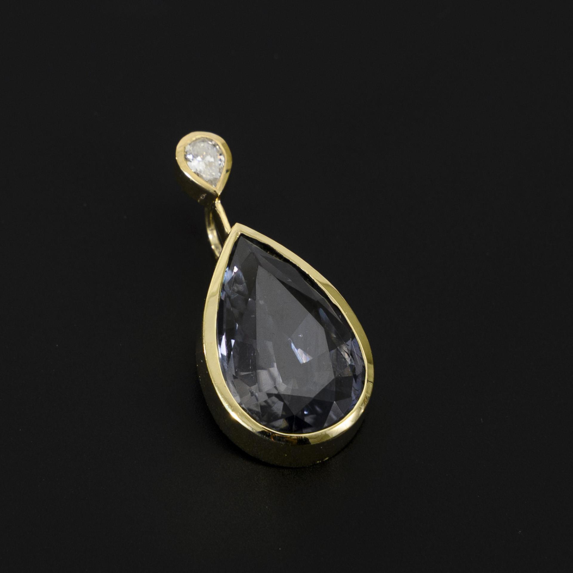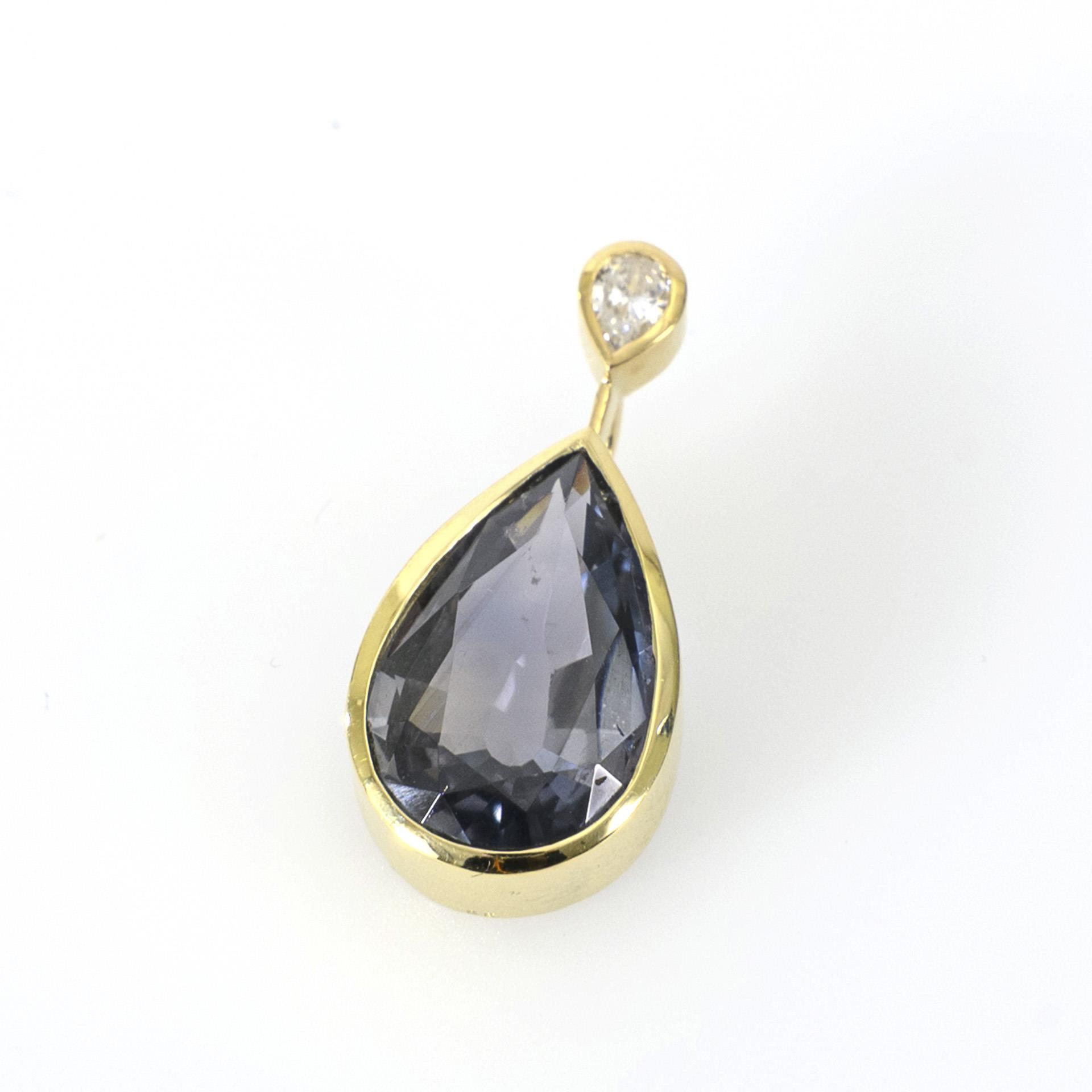 Drop-shaped, bezel-set, color-changing sapphire probably from the Umha Valley (Tanzania), with a diamond drop mounted above, in a classic yellow gold setting.