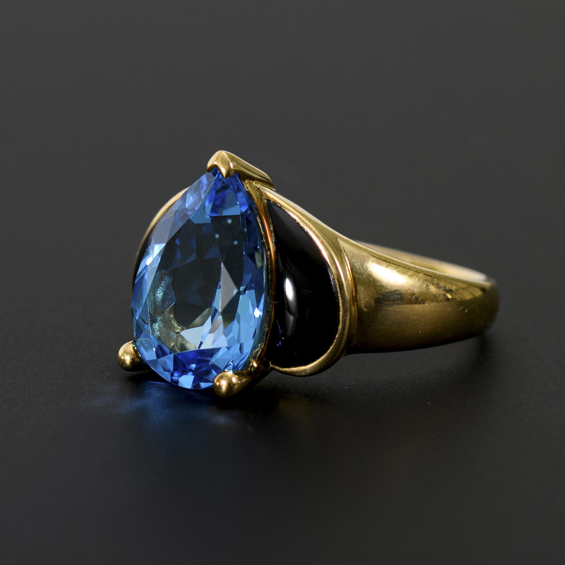 Ring with large drop-shaped blue topaz (treated), between two cabochon-cut onyxes, on a broad shank.