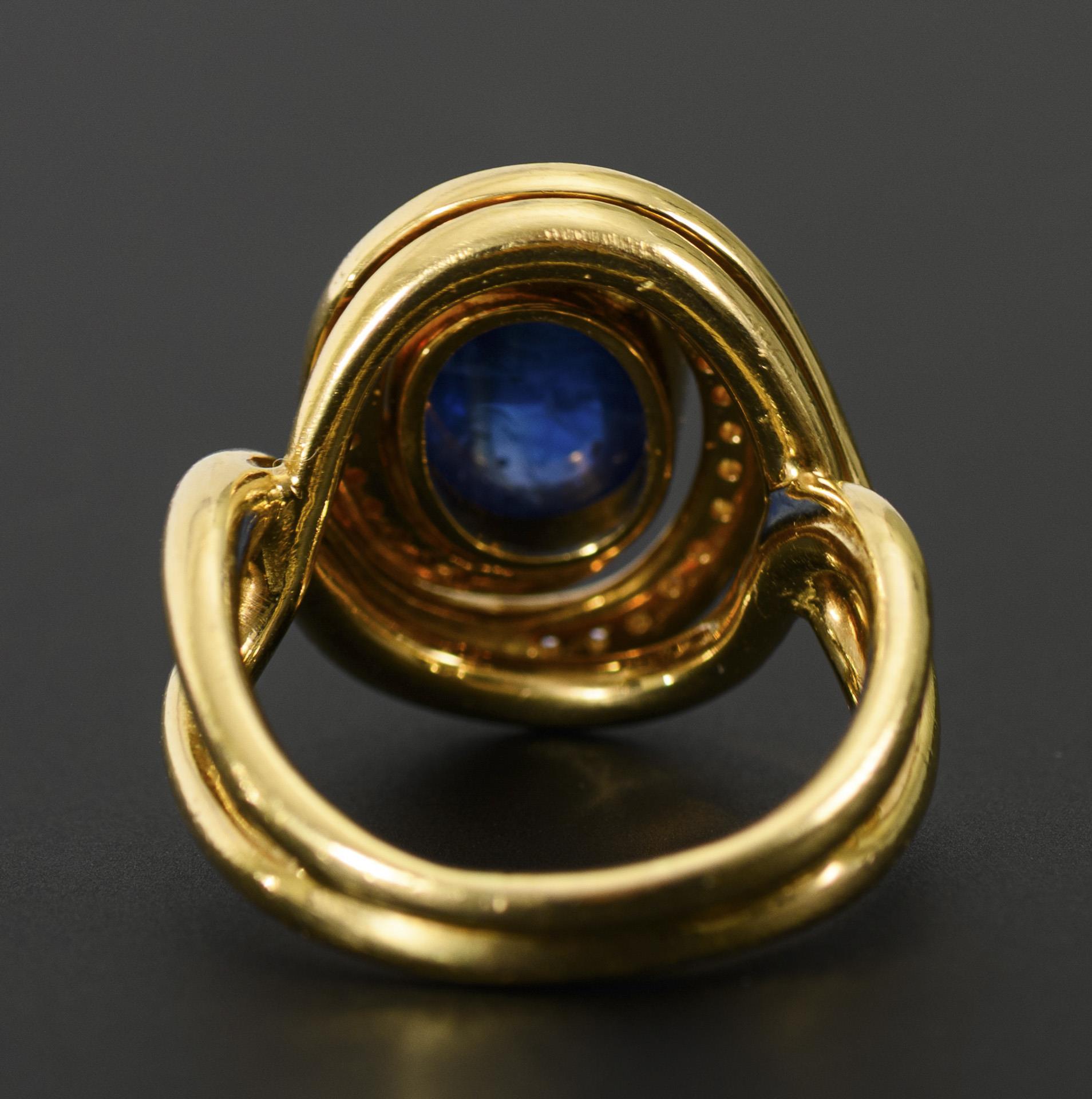 Marked 750 yellow gold, stamped slightly chipped. Ring size 57.5; sapphire approx. 1 x 0.85 cm, approx. 5.50 ct, diamonds together approx. 0.50 ct. 14.31 g.