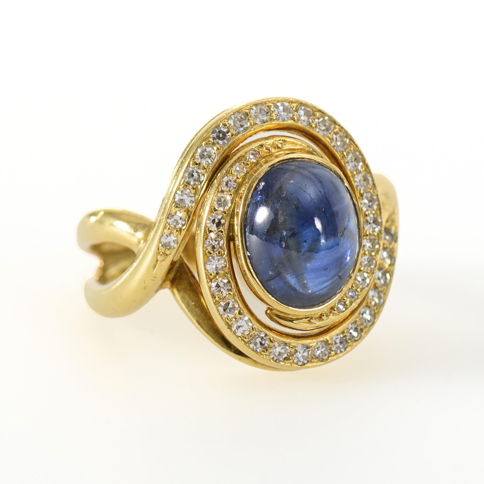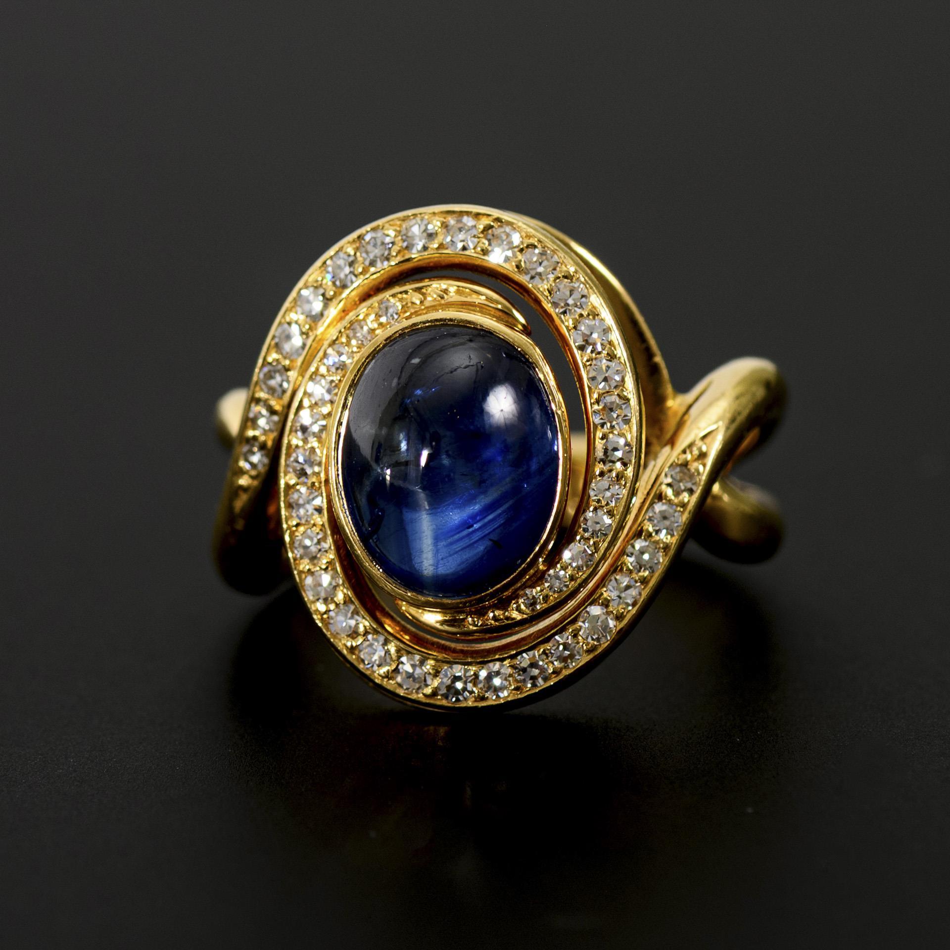 Large ring with sapphire cabochon and diamonds.