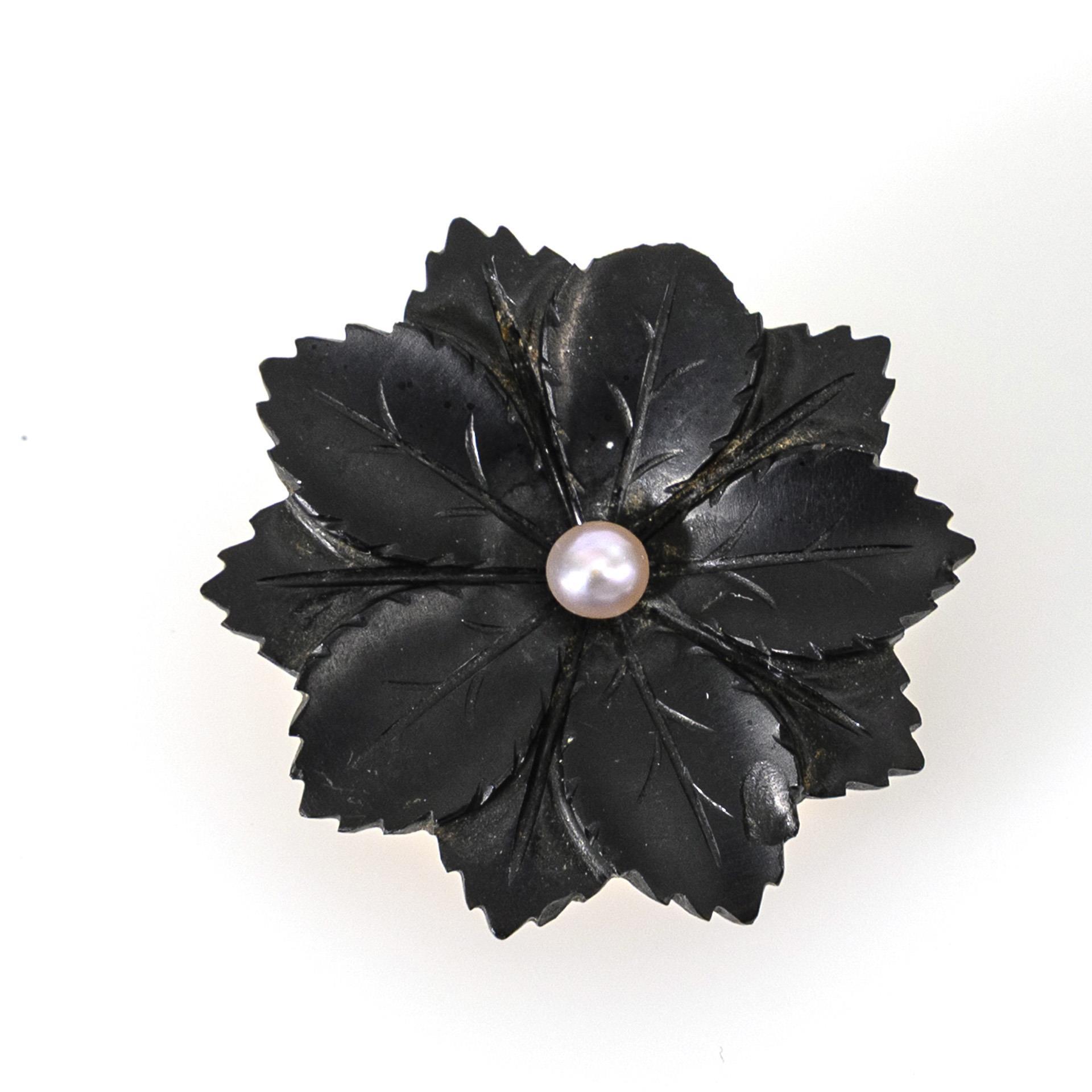 Historical brooch, reverse in yellow gold with large onyx blossom and natural pearl; probably originally worn as mourning jewelry. The lowest petal scuffed.