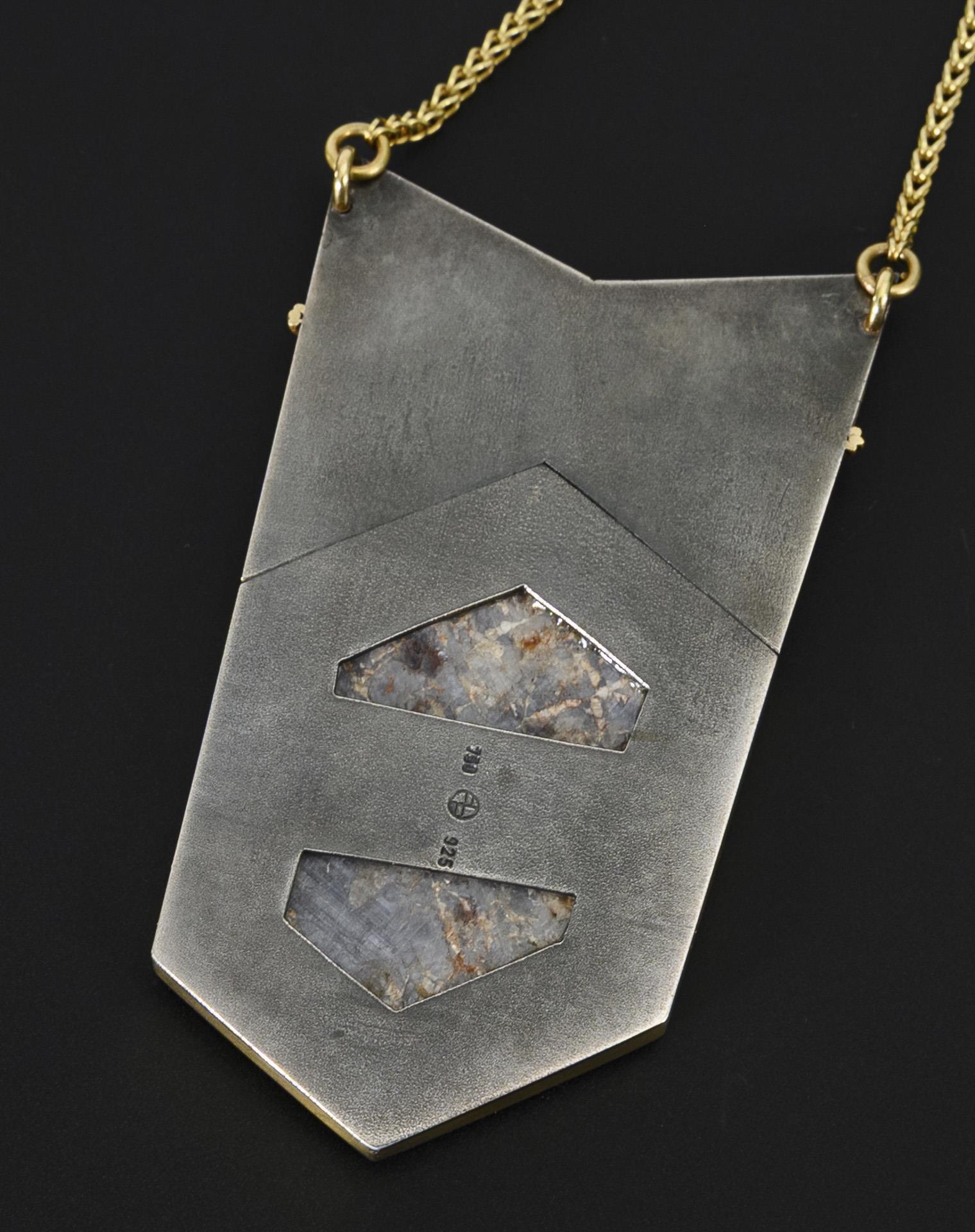 Marked 750 yellow gold and 925 silver. Decorative part max. approx. 7.5 x 4.4, cm, the sapphire cross-section max. approx. 5.0 x 3.7 cm, chain length 61.0 cm. 58,83 g.