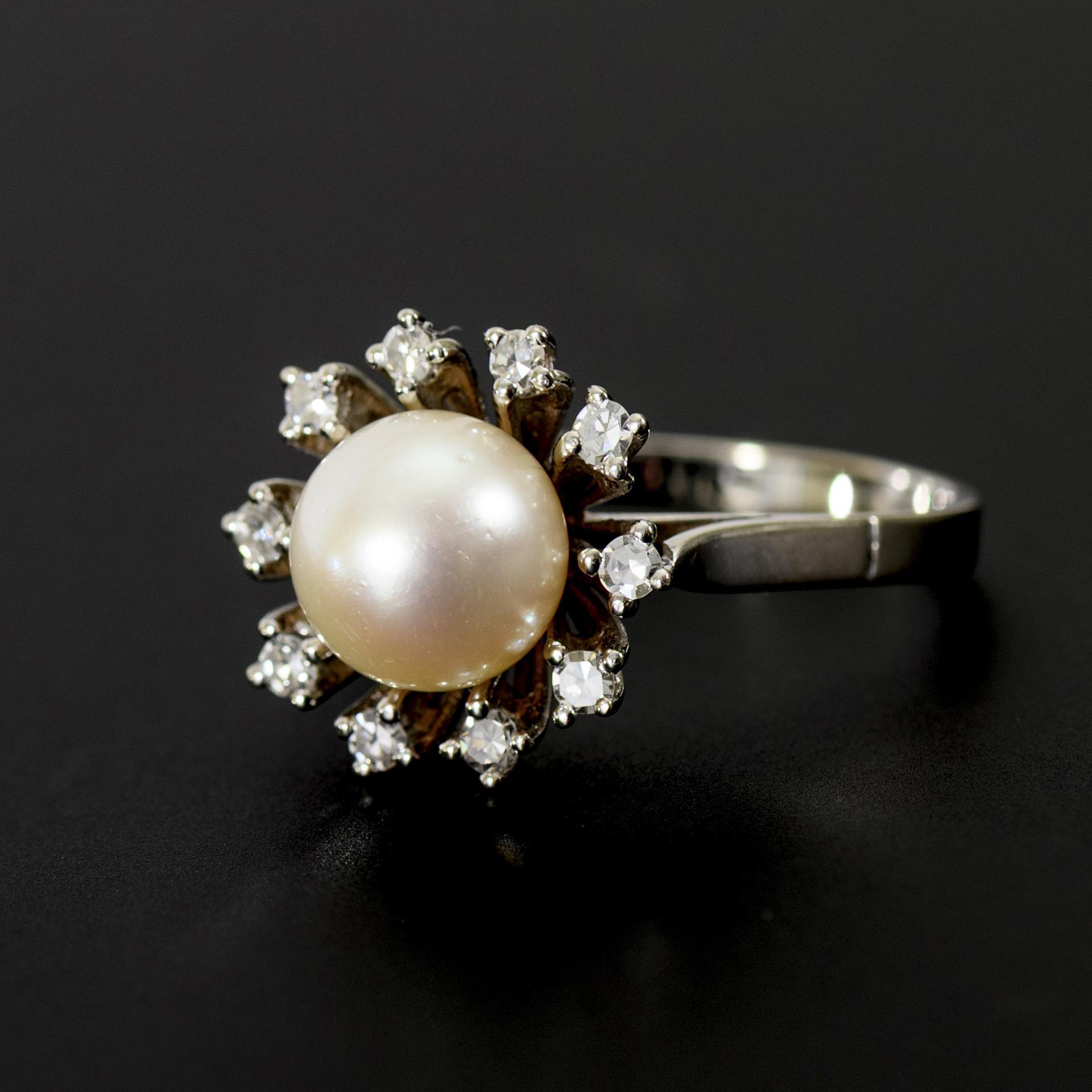 Ring with ring head in classic flower shape with pearl surrounded by 10 single-cut diamonds between a medium band.