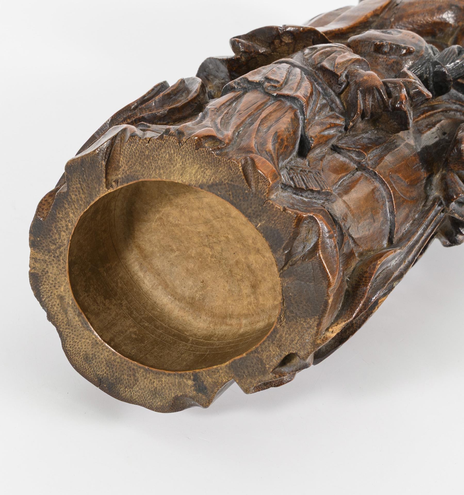 Artfully carved sculpture of a woman with a topknot and a vessel in her arms. At her feet little girl with earrings and rujicepter (?).