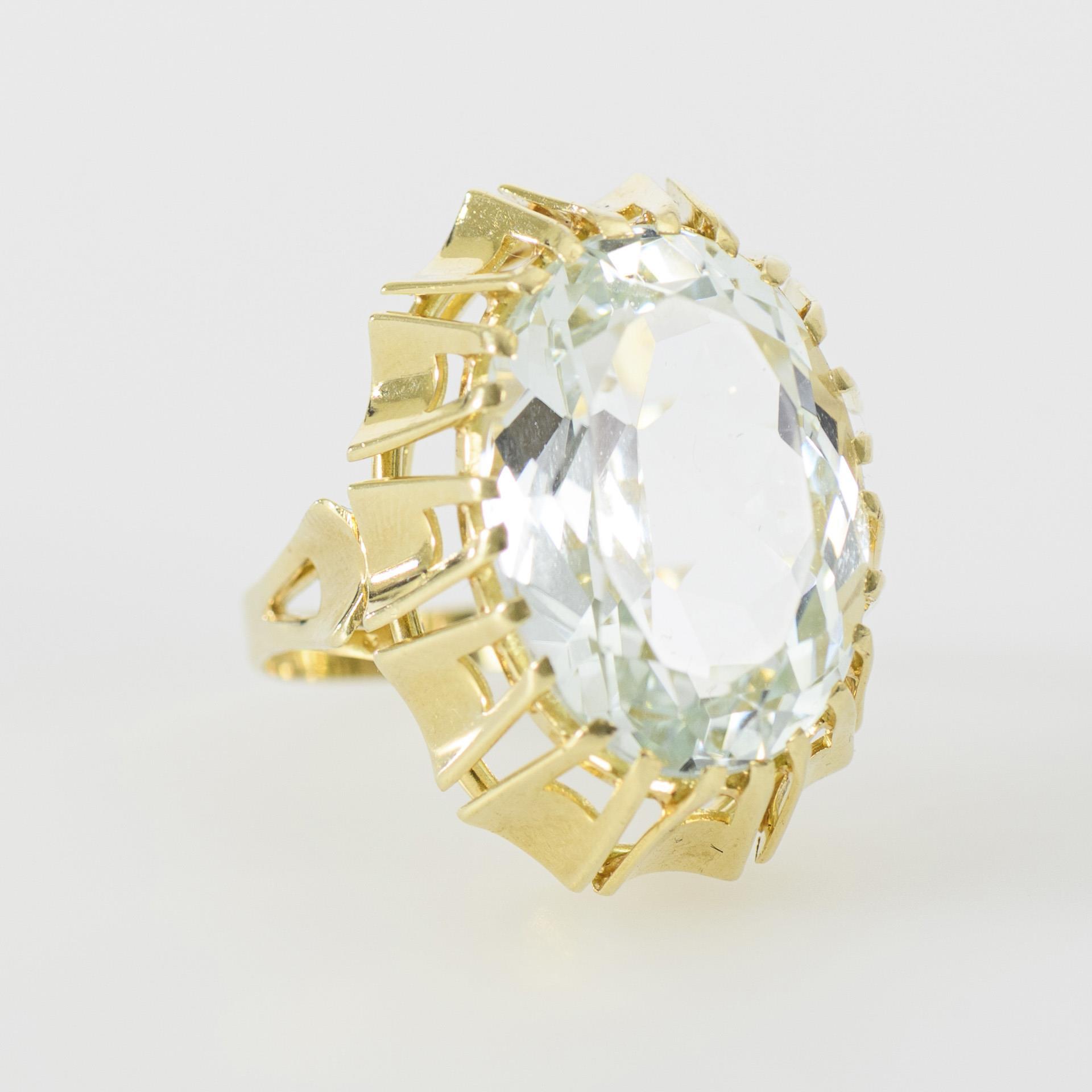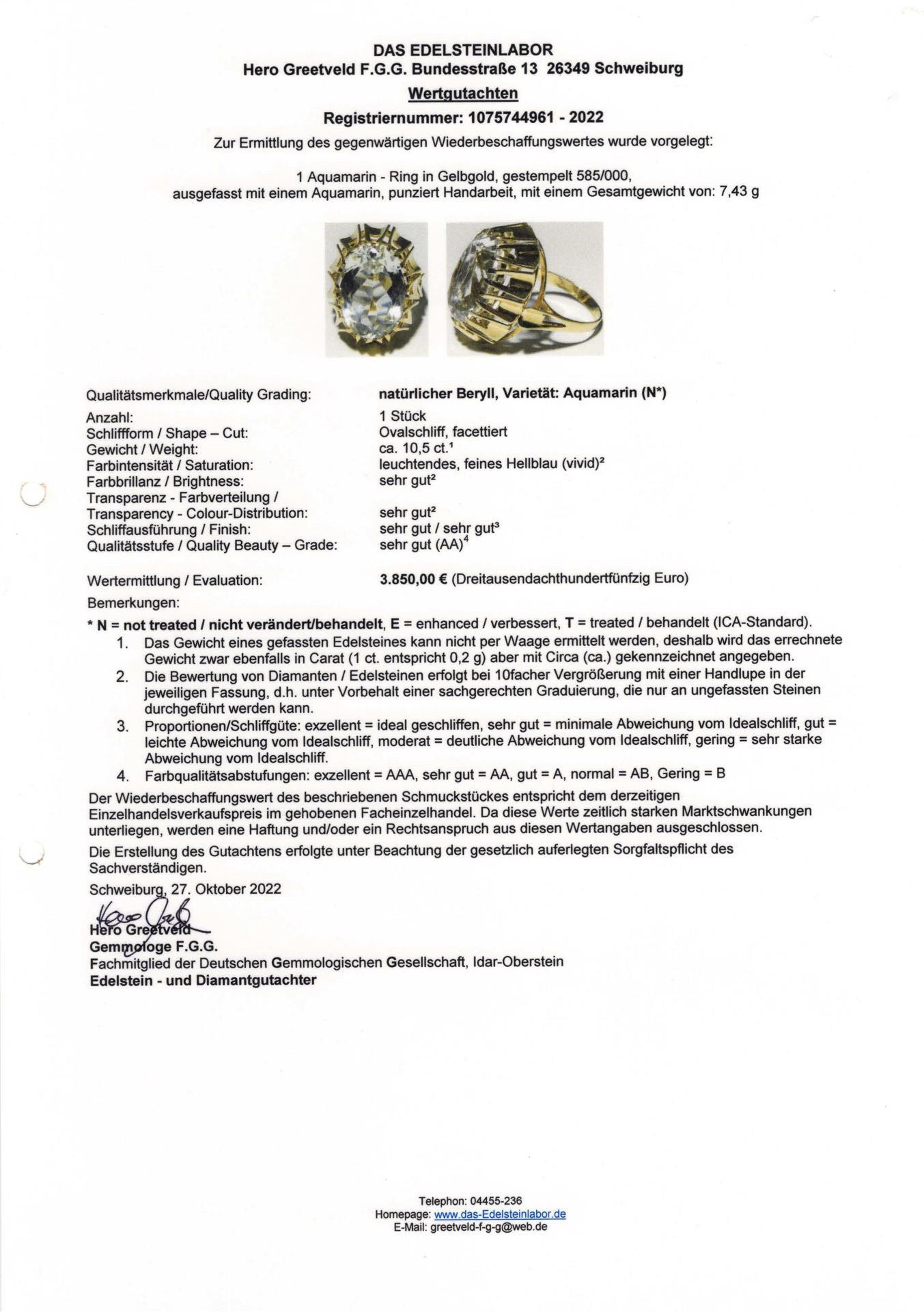 Marked yellow gold 585, additional stamp "HANDARBEIT" [handcrafted]. Ring size 52; the aquamarine approx. 10.5 ct/vivid/AA. 7,43 g.