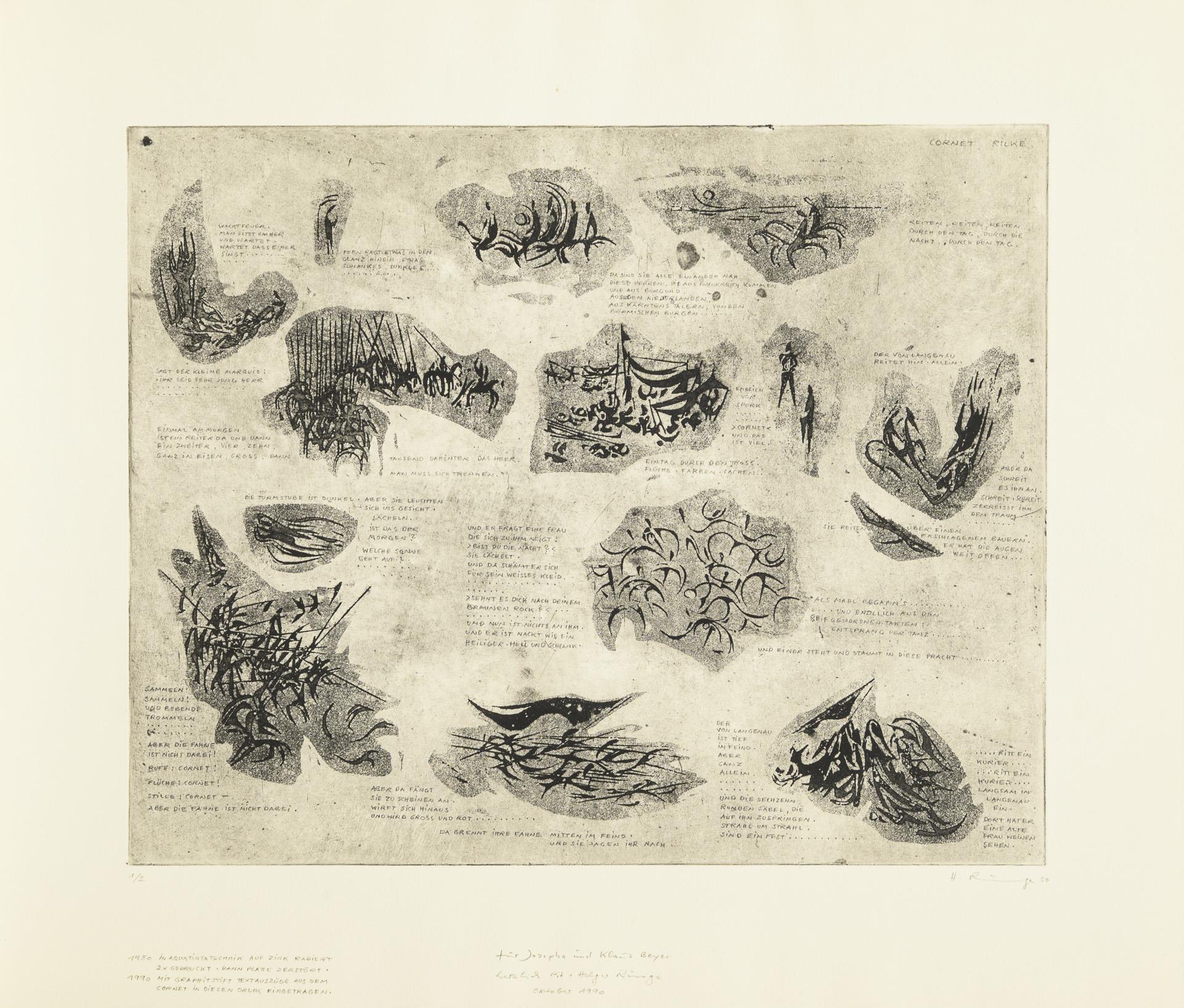 With texts from the 'Cornet' by Rilke. Numbered sheet 1/2. Printed twice in 1950, then plate destroyed, the text excerpts added in 1990.