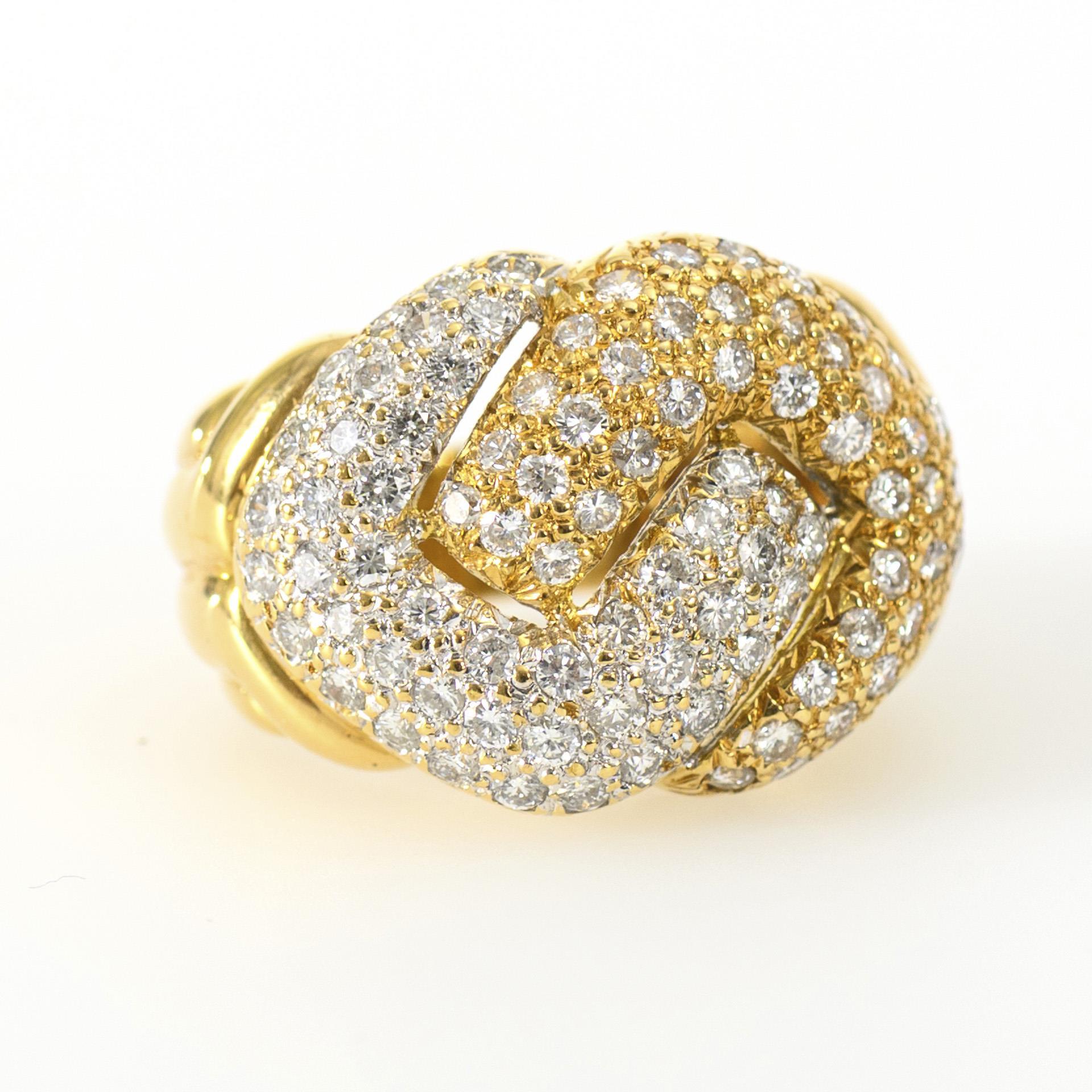 Bicolor designed ring with large ring head designed of 2 intertwined elements with setting of 94 pavé-set small brilliant-cut diamonds of slightly different sizes.