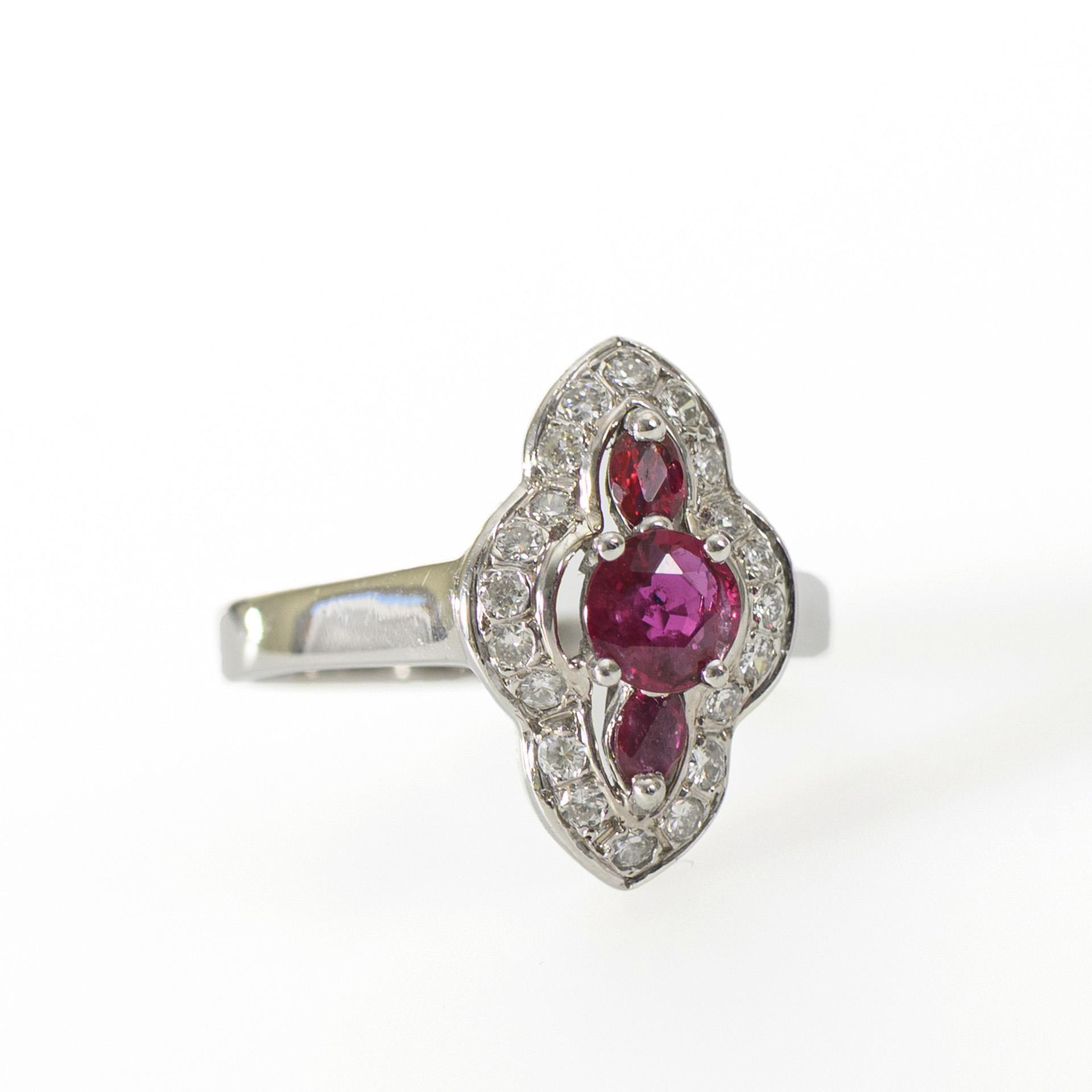 Stamped white gold 585. Ring size 48, the rubies together approx. 0.58 ct./vivid/AA, the diamonds together approx. 0.20 ct./VVS-VS/G-H. 3.71 g.