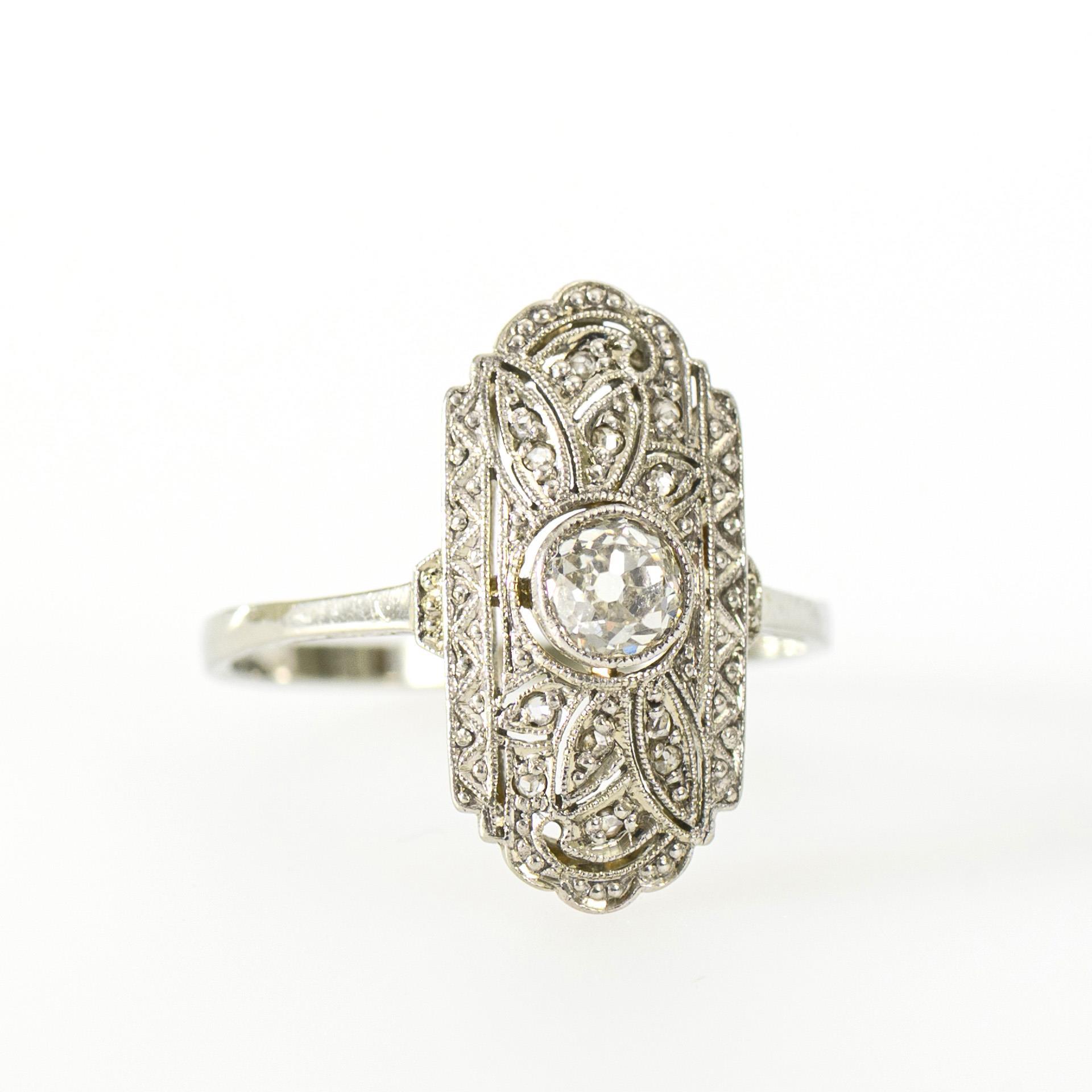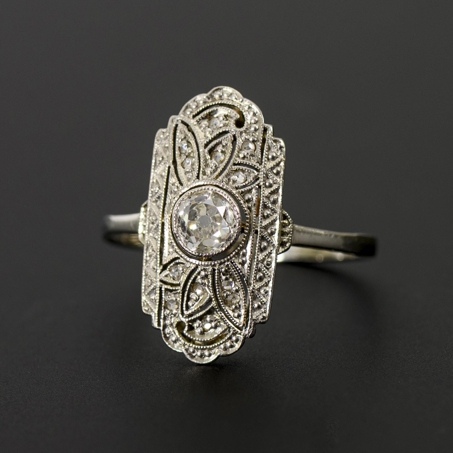 Classic Art Déco ring with a central, bezel-set old-cut diamond in an elongated oval ring head with small diamonds, decorated with millegrain décor typical of the period.