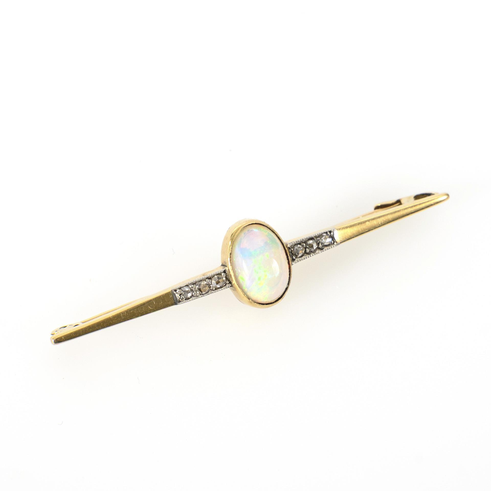Classic bar brooch with bezel-set opal cabochon, framed on each side by 3 small pavé-set diamonds.