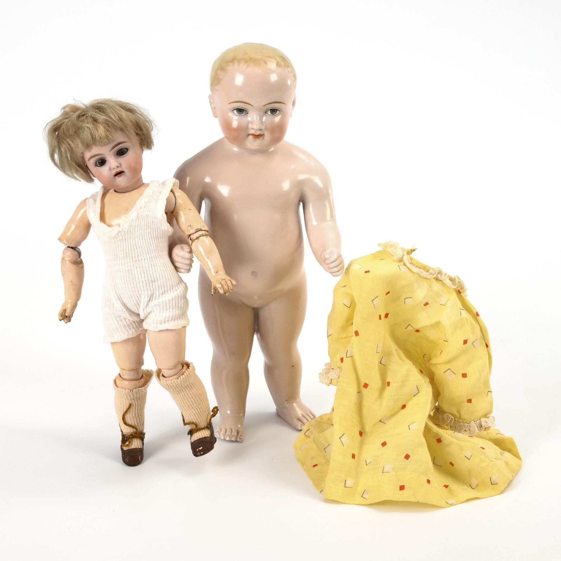 Dainty little doll (indistinctly marked) with cranked head, brown sleeping eyes, blond mohair wig and 15-part jointed body in underwear. Body with small defects (l 26 cm). / Blonde naked frog, so-called "Frozen Charlotte", in yellow dress (L 29 cm).