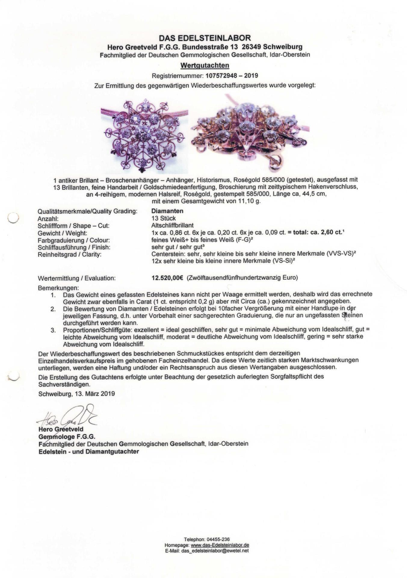 Pendant brooch rose gold 585 tested, hoop rose gold 585 stamped. Diameter of the pendant brooch 2.9 cm, old-cut diamonds together approx. 2.60 ct/F-G/center stone VVS-VS, the others VS-Si, chain length 44.5 cm. 11,1 g.