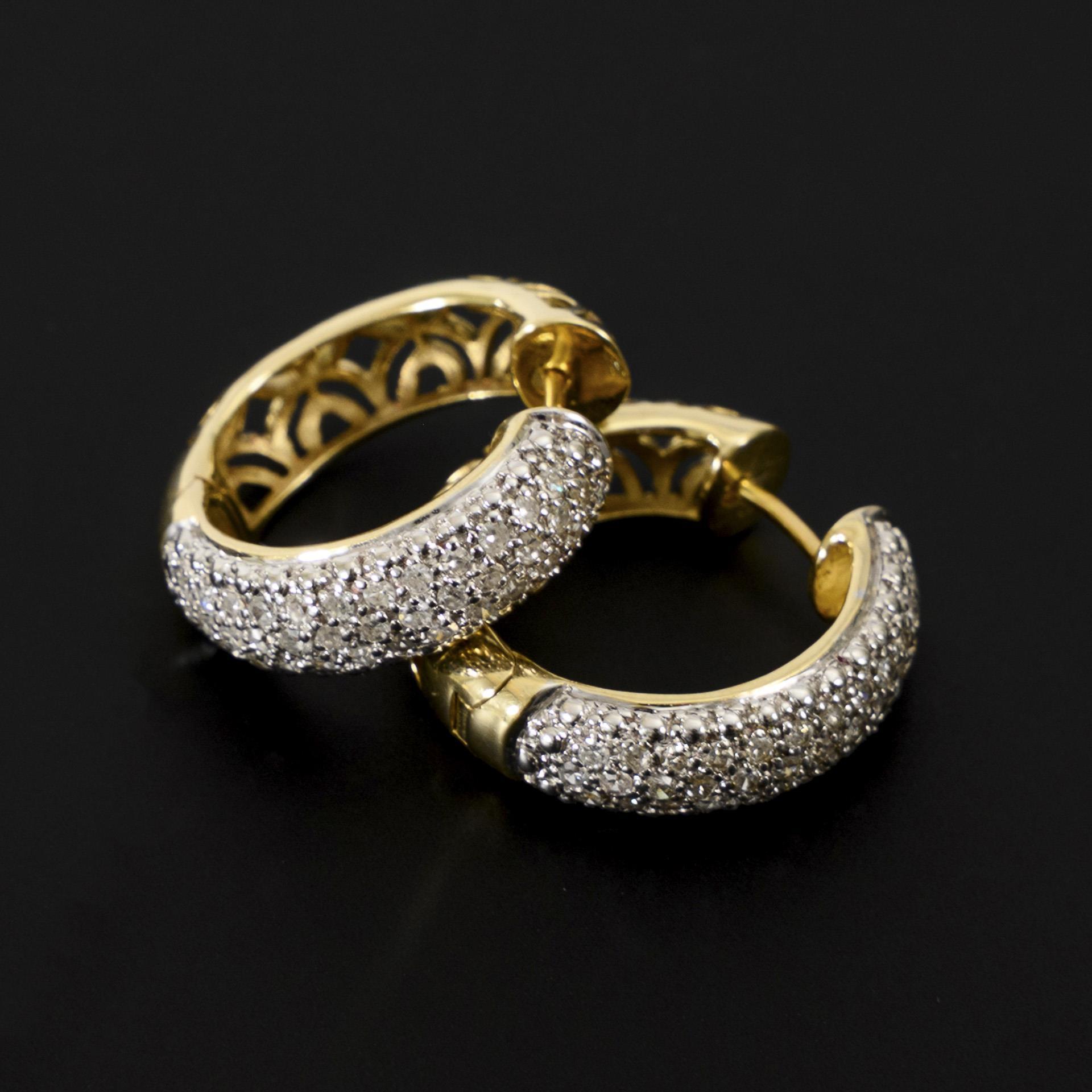 Each stamped yellow and white gold 585. Inner diameter each approx. 16, outer diameter each approx. 23 mm; diamonds together approx. 1.11 ct/G-H/LR-VVS. 9,54 g.