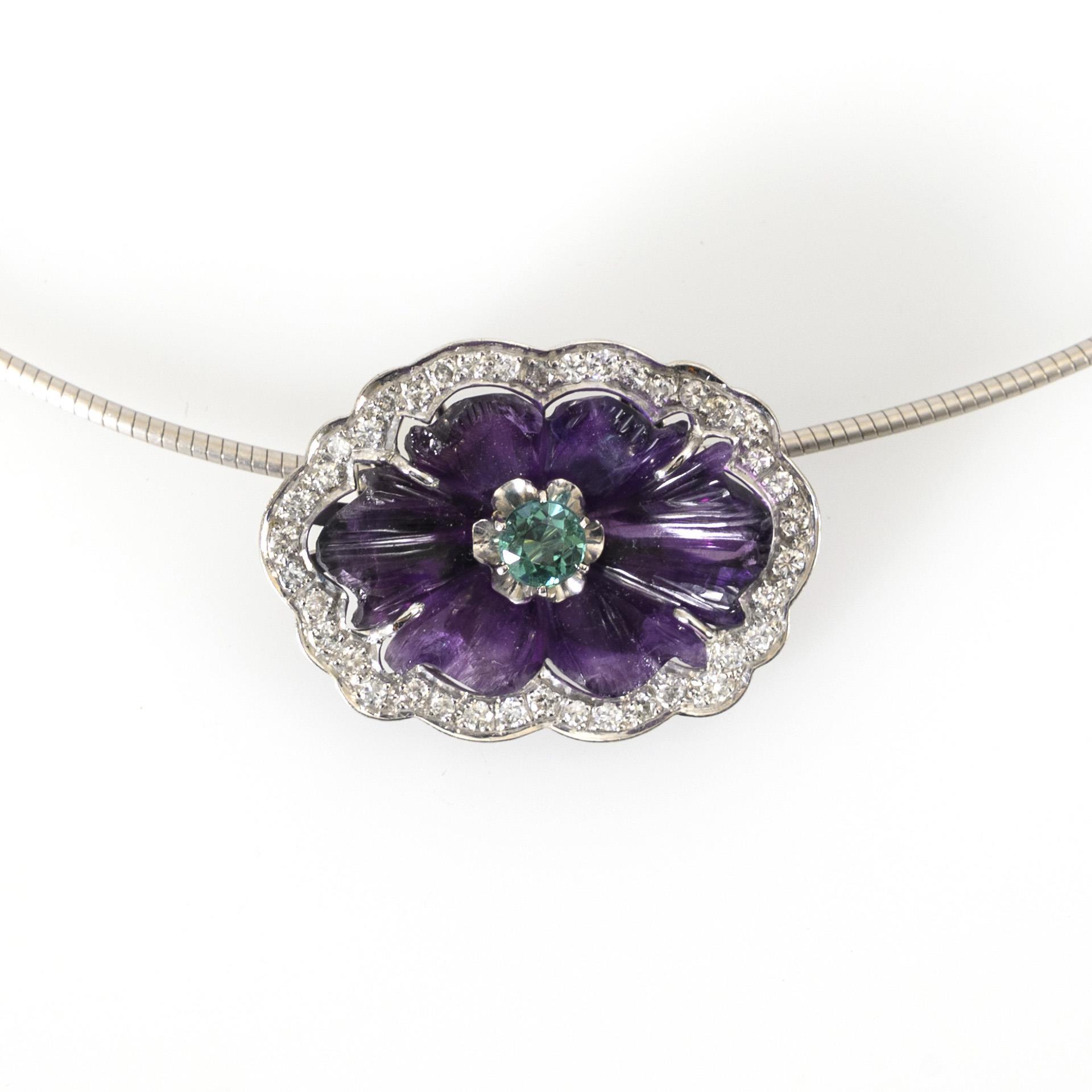 Unusual pendant with a large flower carved from amethyst with a verdelite representing the pistil and a border of 40 pavé-set brilliant-cut diamonds. One petal with a small chip on the edge.