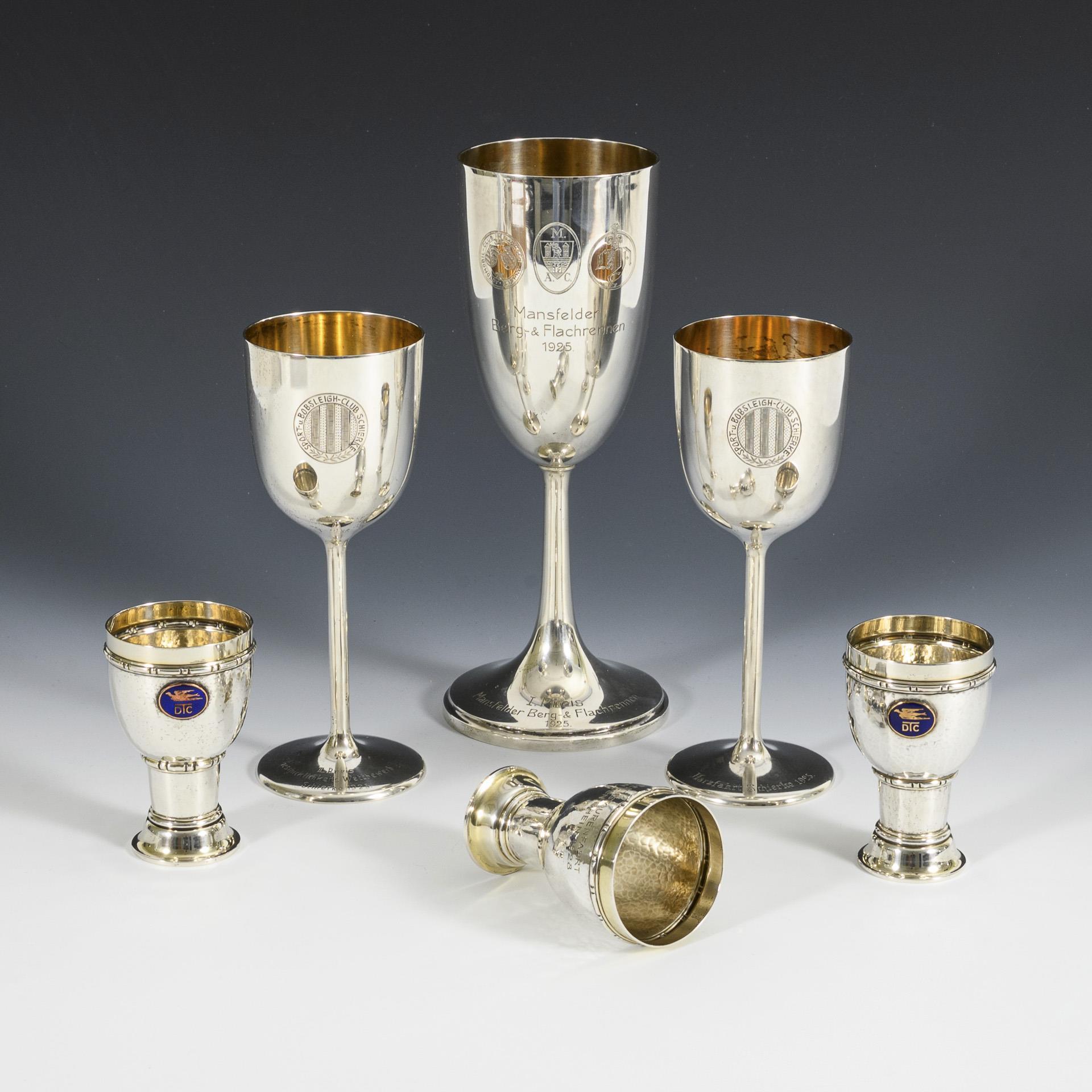 3 long-stemmed prize goblets with engravings and 3 small foot cups with blue enameled plaque.