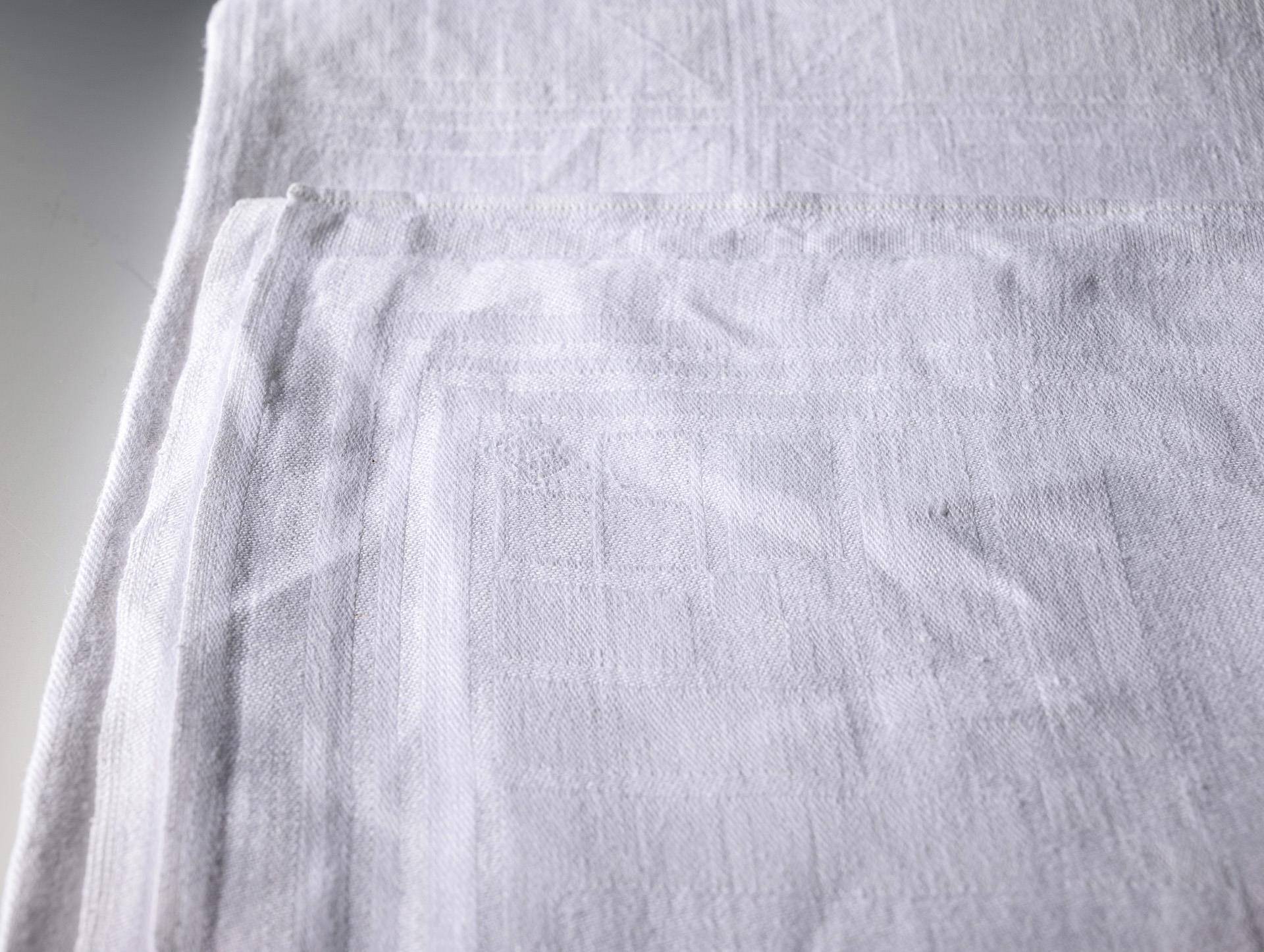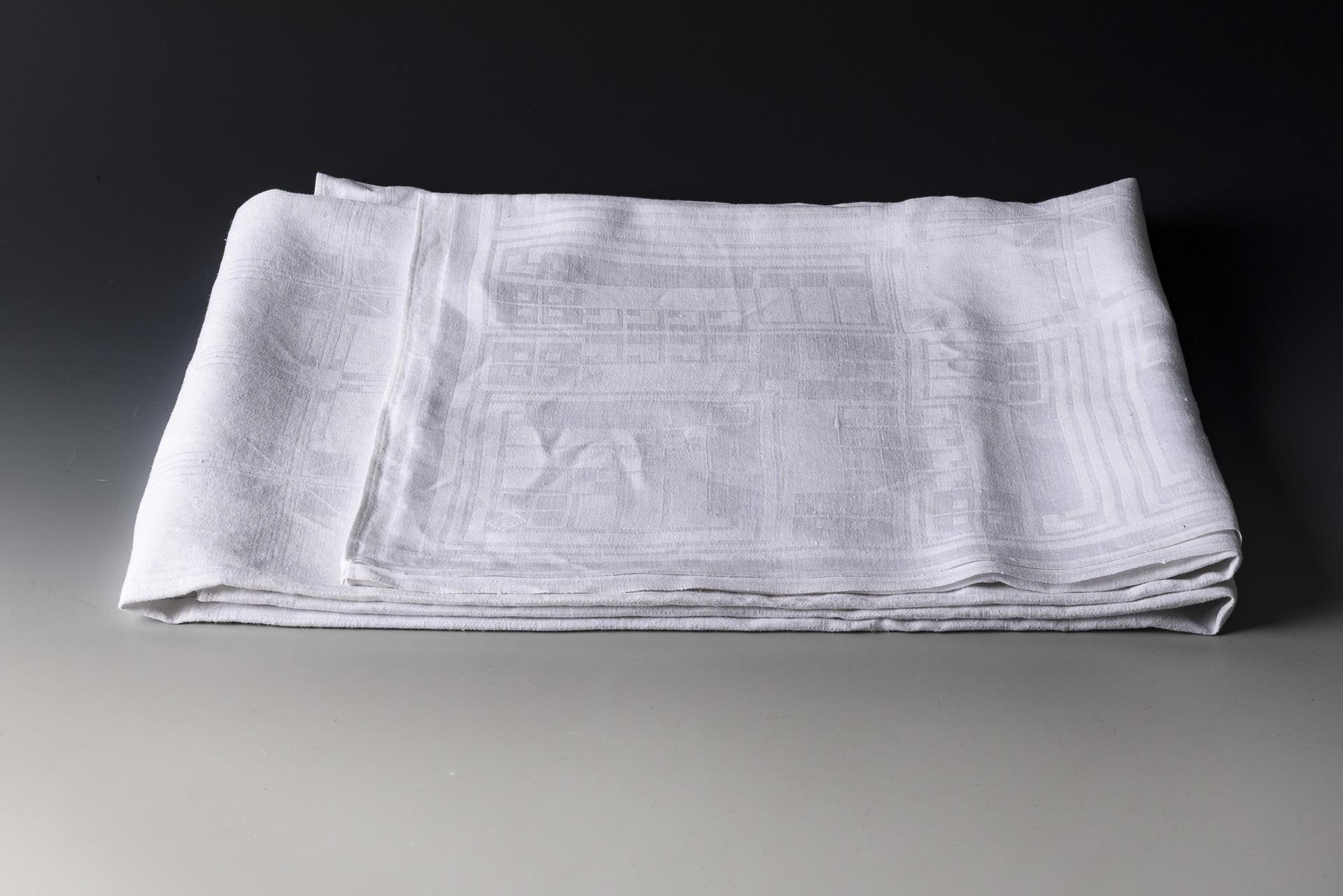 Square tablecloth with continuous square repeat pattern and similarly designed border; white embroidered monogram "AS".