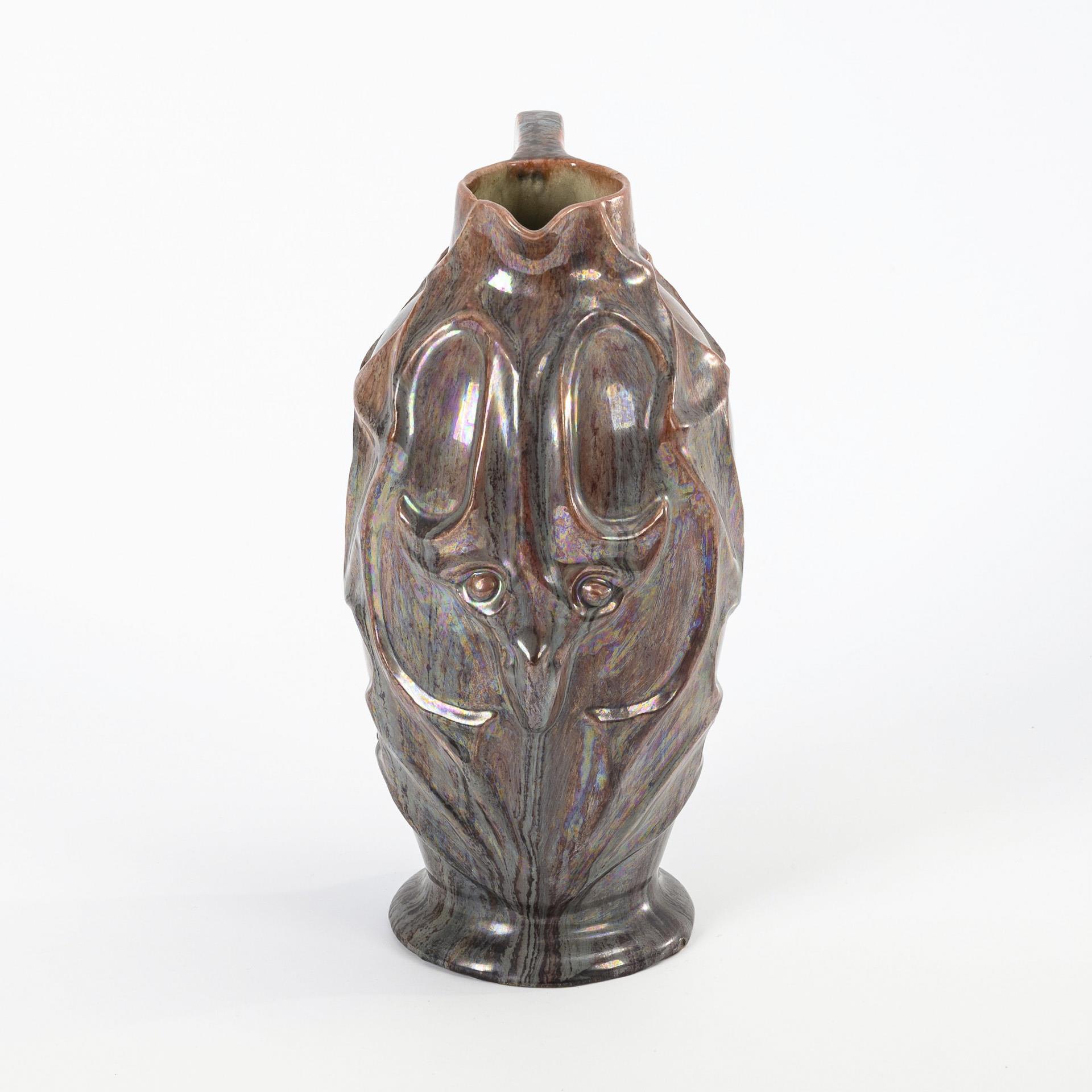 Slim ovoid body with relief wall in flowing abstract forms, a stylized dragon head on the front and at the base of the handle, high-set, angled handle, round foot. Hair-cracked at the base.