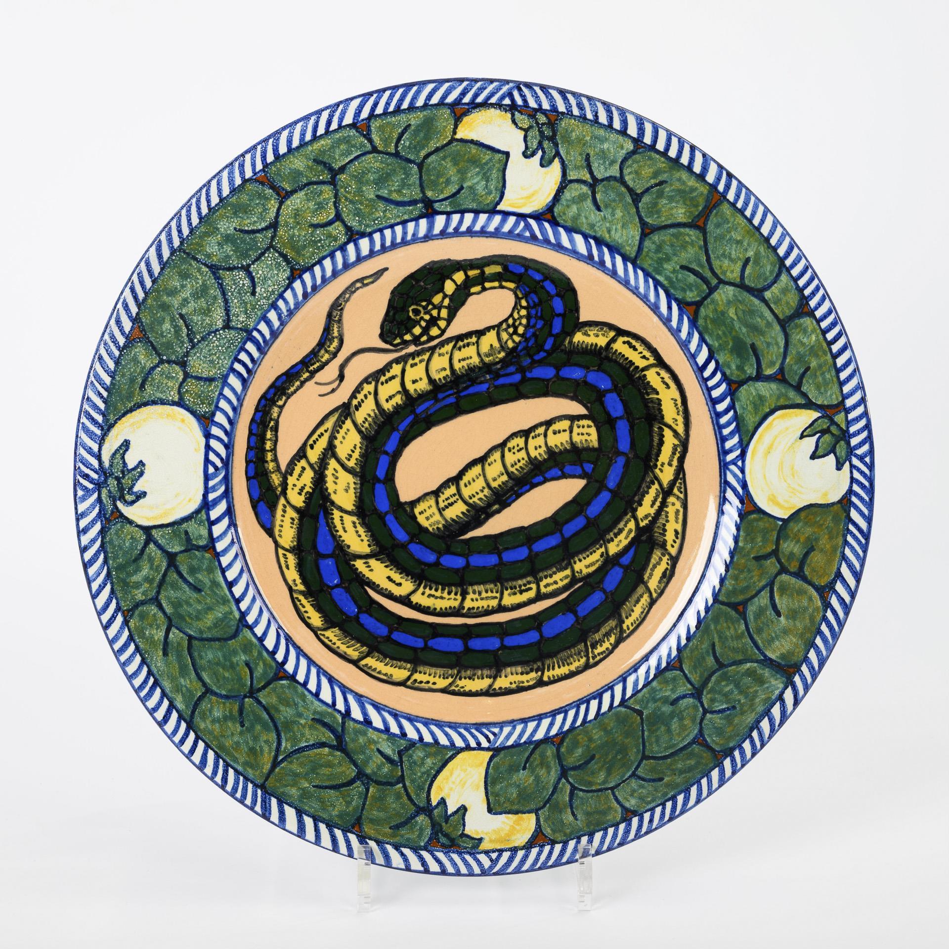 Flat, round wall plate with a coiled snake, wide rim with scale decoration and fruit. Corresponds to model no. 7. Without suspension. Production-related glaze bubbles on the rim.