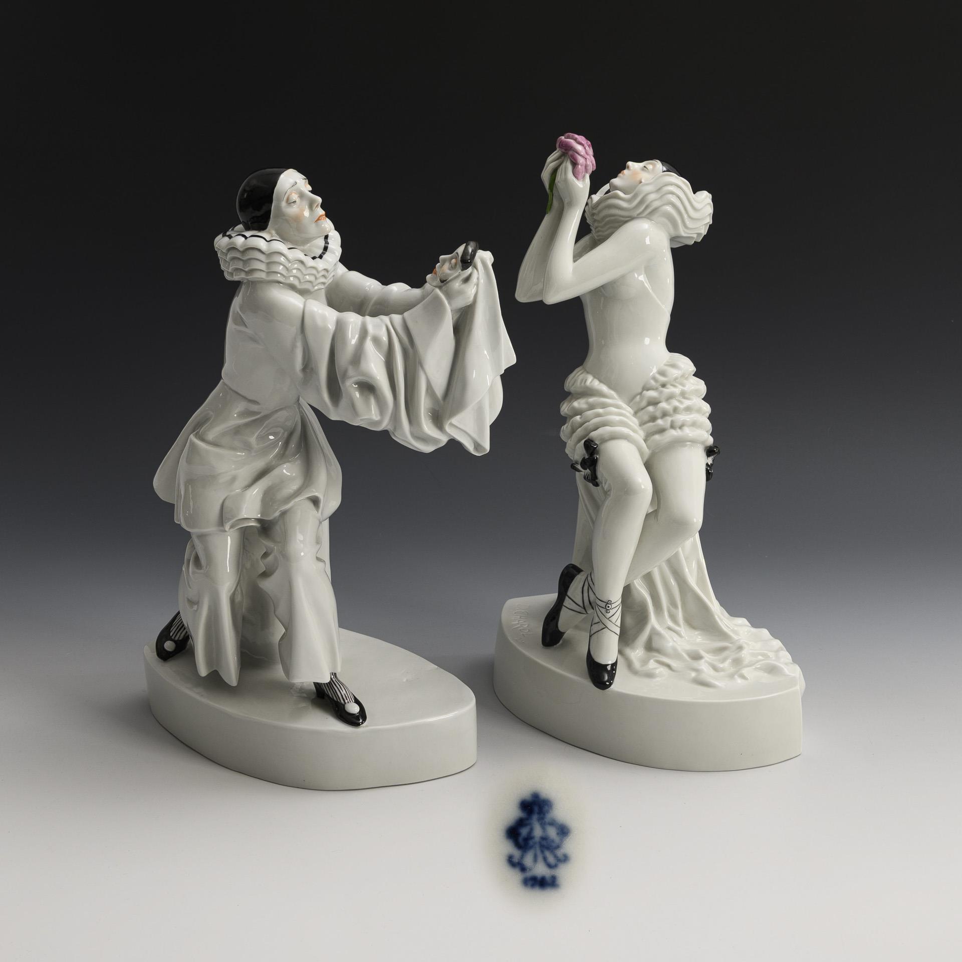 1x Bajazzo (Pierrot), design 1919: Pierrot sitting on a column stump, wistfully contemplating a female mask / 1x Columbine, design 1923: Columbine sitting on a pedestal, contemplating a large rose in her hands.