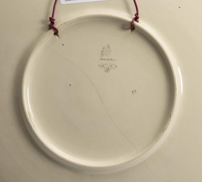 Stoneware, matt green ground, translucent white figure reliefs in the style of pâte-sur-pâte painting and Wedgwood ware, floral chromolite decoration. Ø 45 cm.