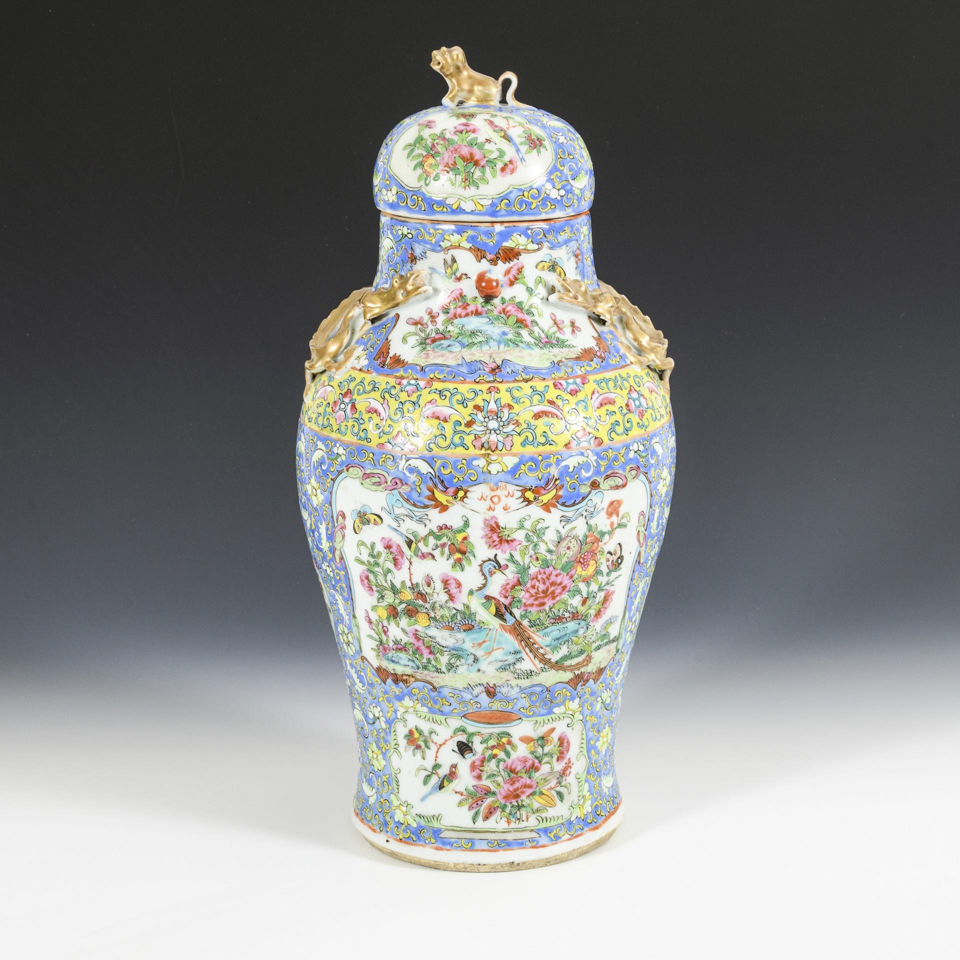Polychrome painting with colorful enamel colors. Cartouches with floral and bird motifs, surrounded by a rich vine pattern. Dragon-shaped, flat handles.
