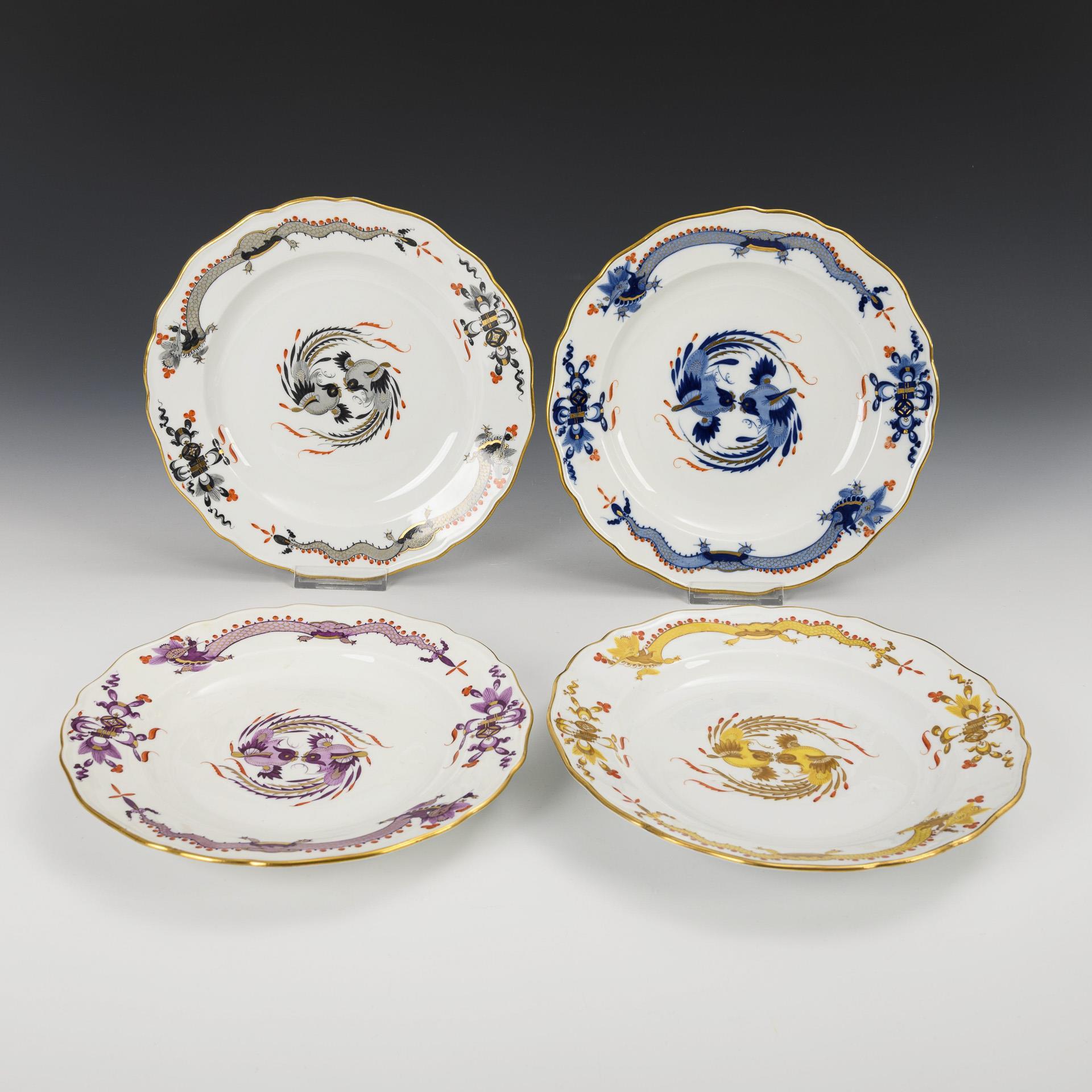 Dining plate in the shape "New Cutout" with the decoration "Rich Dragon" in yellow, blue, gray and purple.