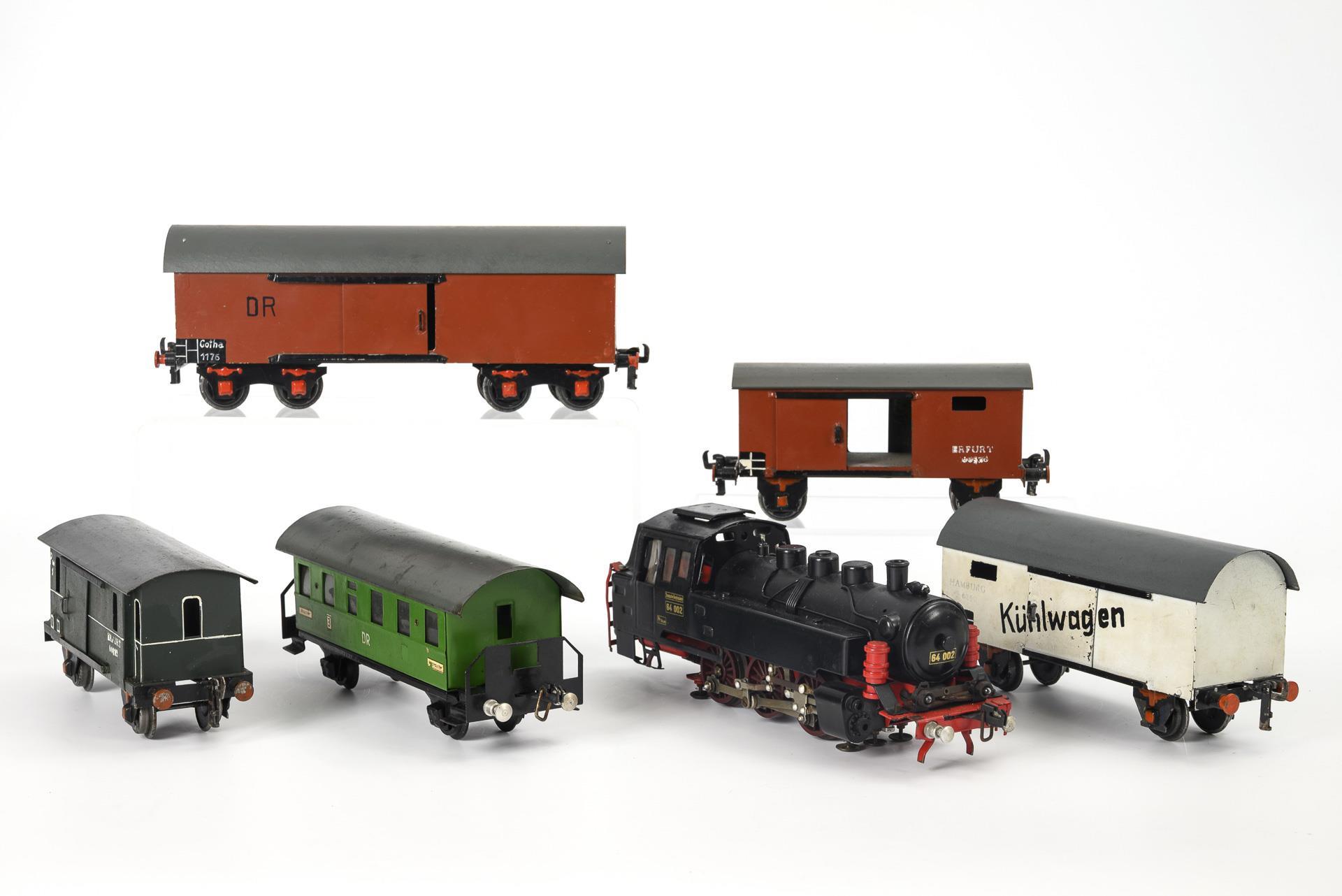 0 Gauge. Black locomotive "64 002" for electric operation, 1 green "DR" passenger car, 5 baggage cars, 5 open freight cars, and 2 flat cars. Used. Function and completeness not checked.