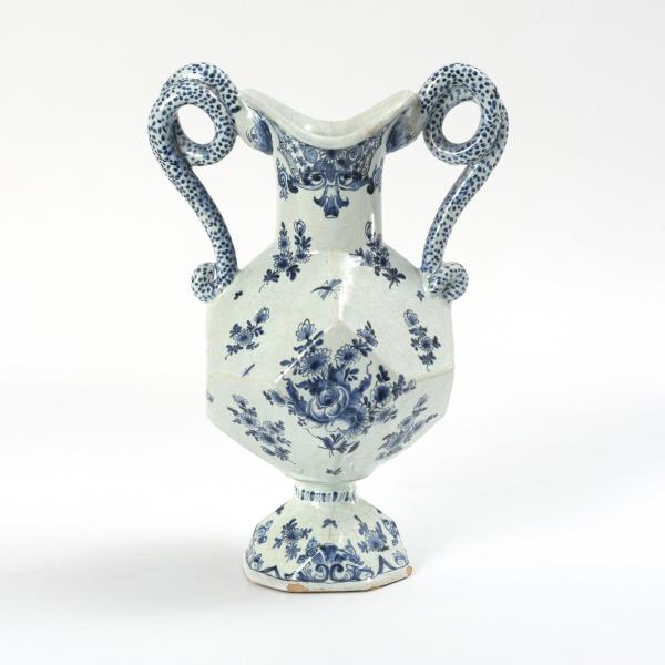 Cornered globular vase with cylindrical narrow neck, dotted snake handles and faceted round foot, on the front a landscape with sailing boats and wanderers, on the back flowers and insects. Small knocks to the stand.