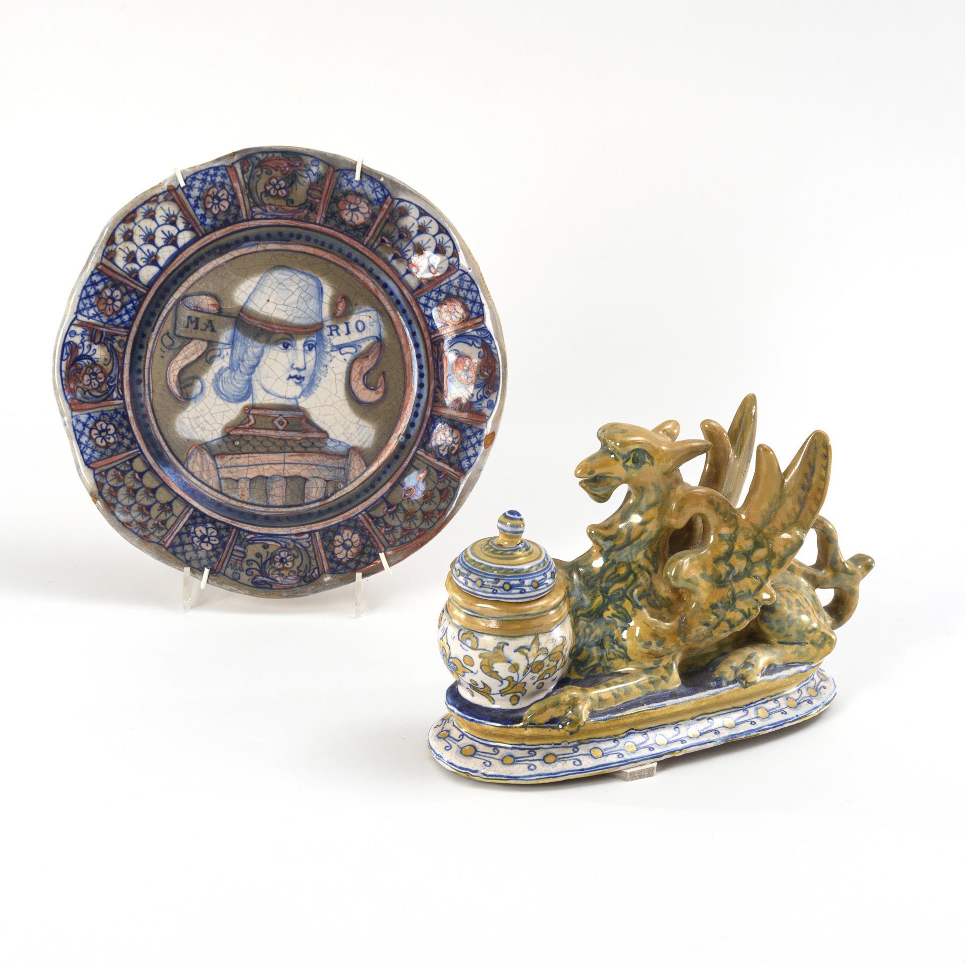 Oval writing utensil with recumbent griffin sculpture as guardian of the inkwell with lid (without insert) (L 21.5 cm). Round, slightly curved plate in the style of Italian Renaissance majolica, in the mirror the bust of a young man, inscribed "Mario", flag with alternating floral reserves, with wall mount (Ø 21 cm). Writing utensil restored, lid knob glued. Writing utensils and plate slightly chipped in places.