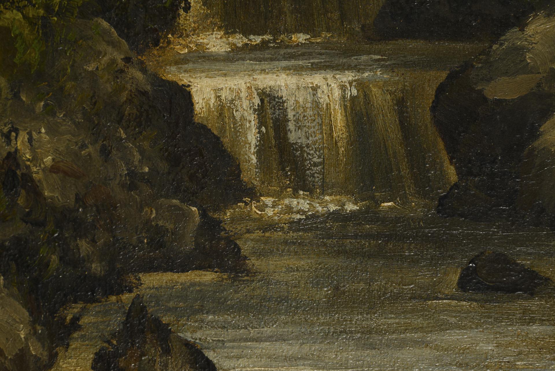 Stream with small waterfalls between mountain slopes with coniferous forests. Minimal traces of age.