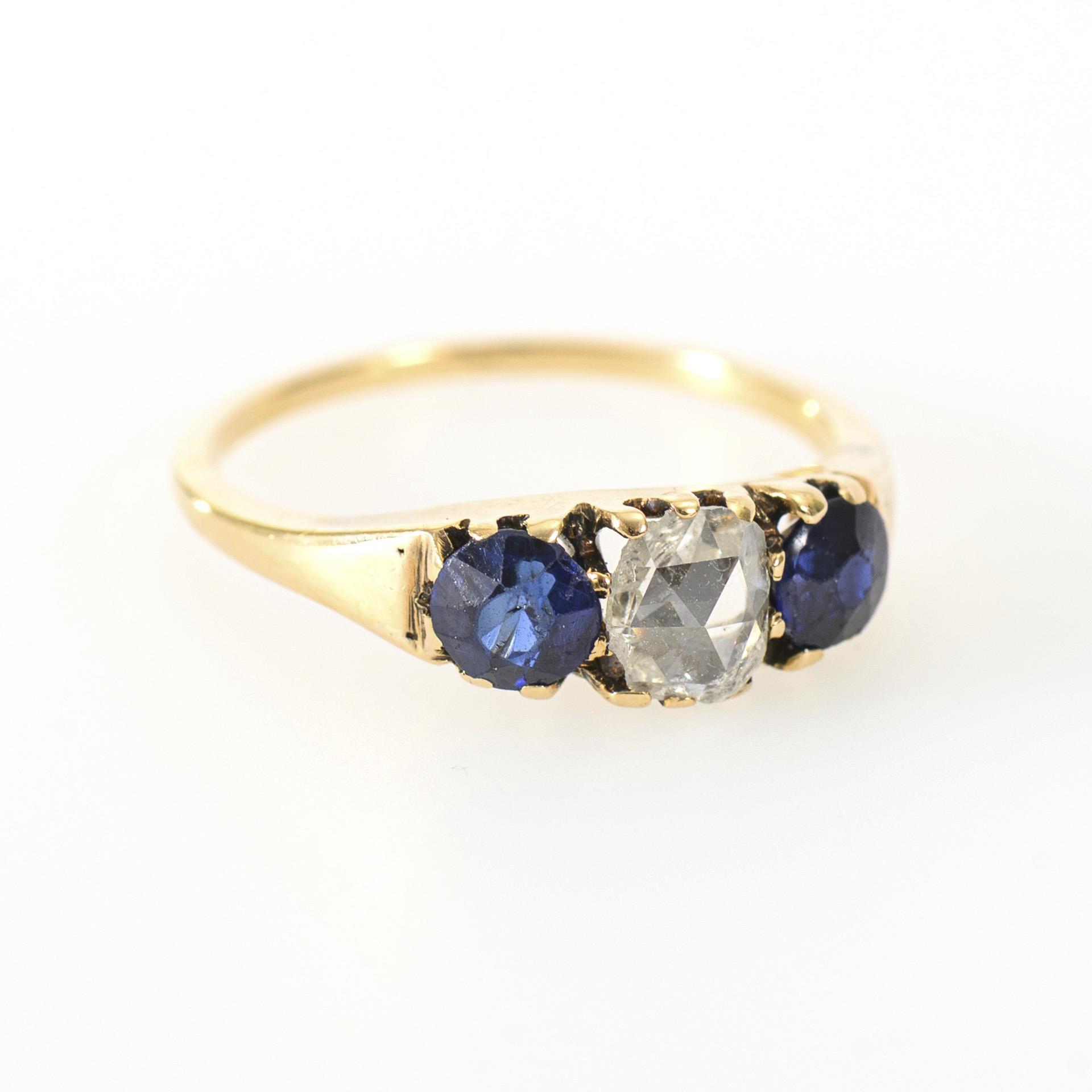 Elegant ring with trilogy of 2 blue colored stones, possibly sapphires, and a rose-cut diamond. Chips and scuffing of the cut edges on the stone setting, not affecting the overall impression; 1 blue stone with 2 chips in the table, edge of the diamond with chips.