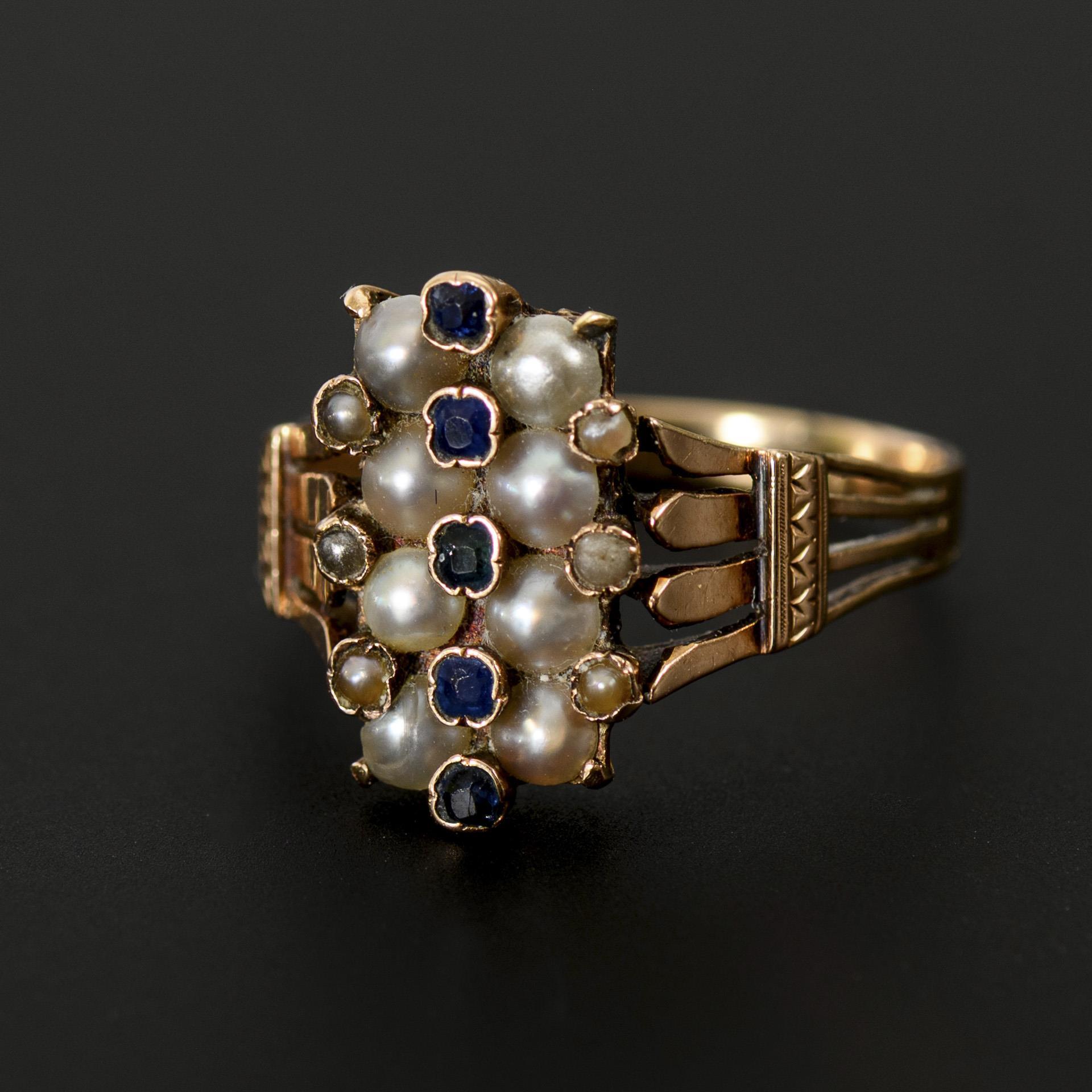 Ring with large, rectangular ring head set with pearls and blue colored stones, probably sapphires, between an architecturally designed band. Prior enlargement of the ring band visible; pearl setting with natural traces of growth, 3 seed pearls with traces of age and wear.