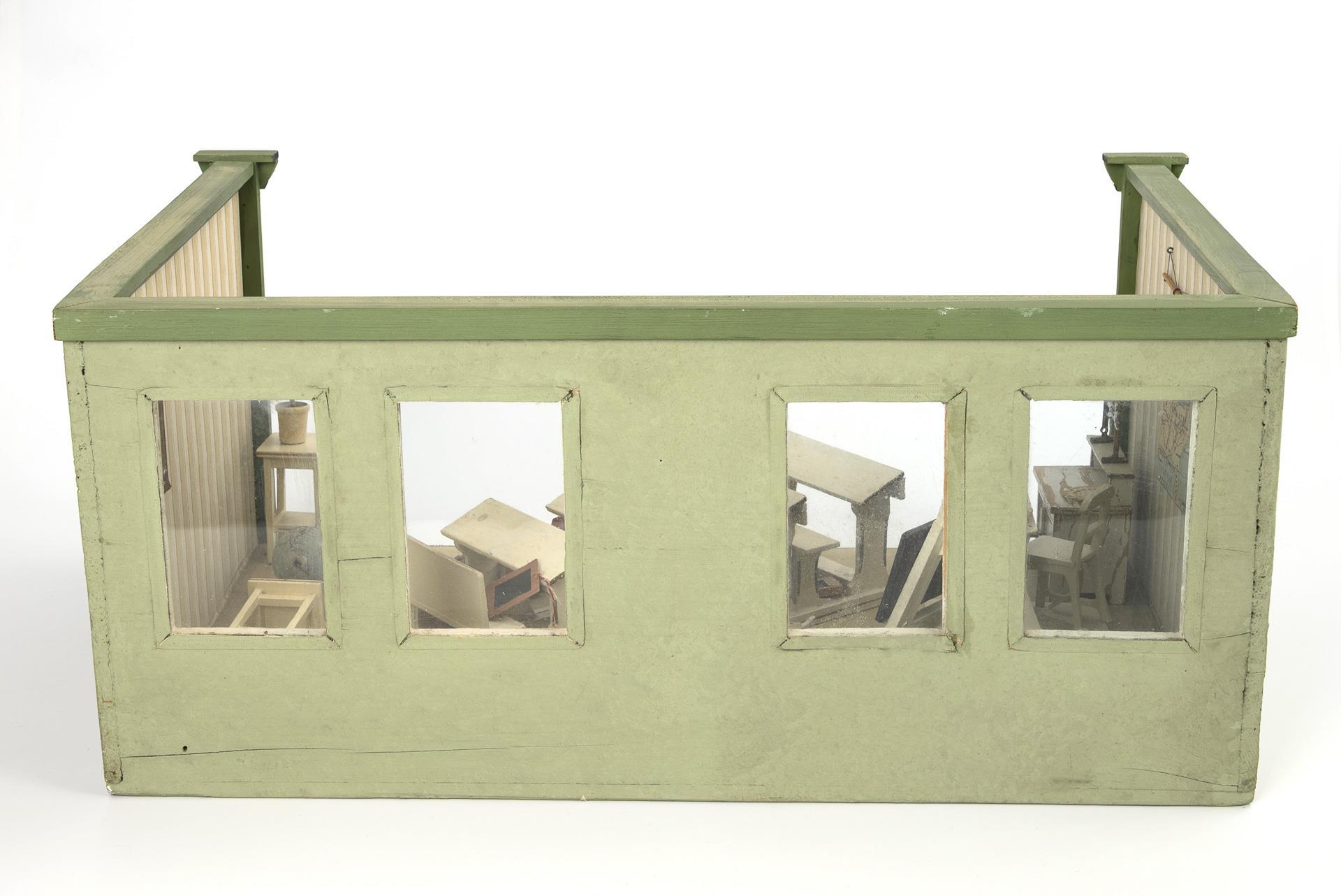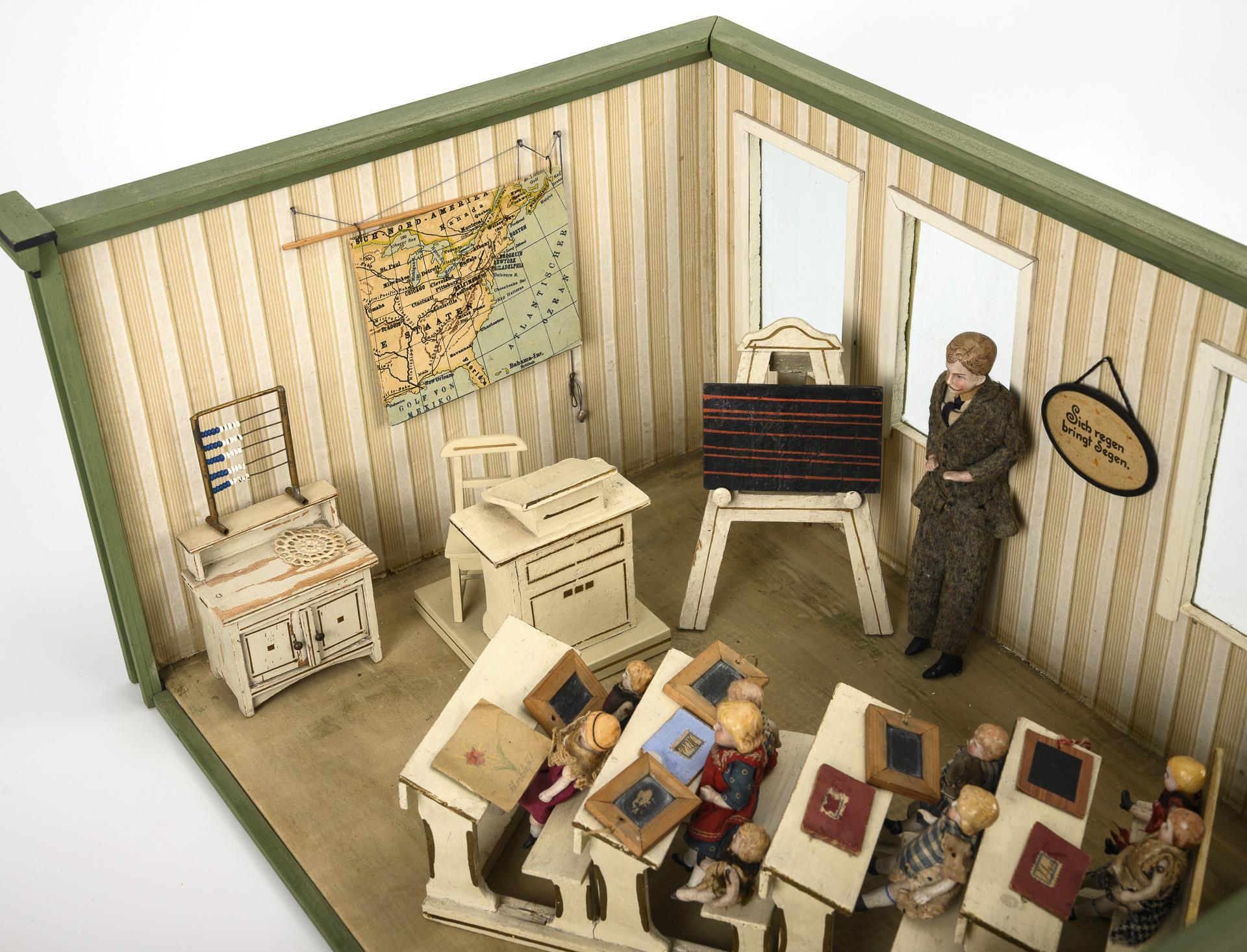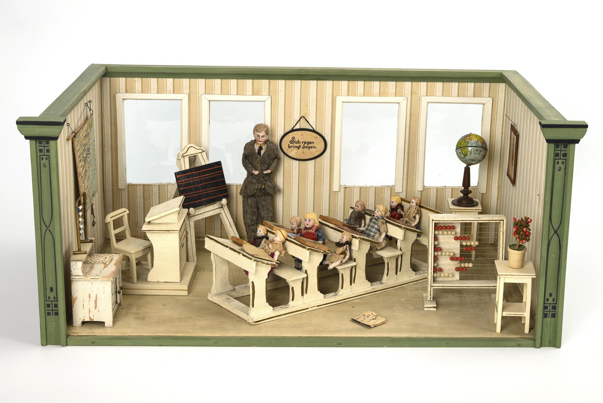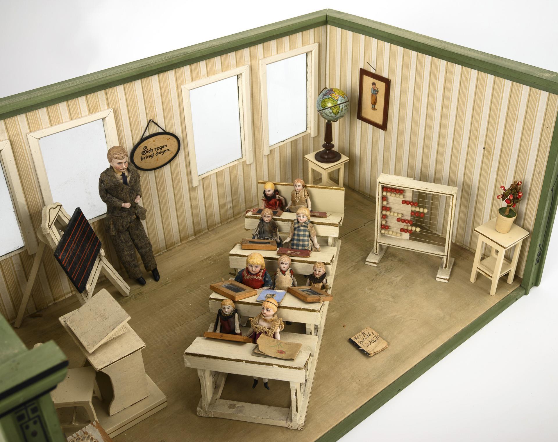 1-room cabinet with 4 glazed windows. Furnished as a school with teacher's desk, blackboard, pupil's bench, cupboard and 2 slide rules. Including 10 dolls with defects. Signs of age, 1 dry crack in the floor, small defects.