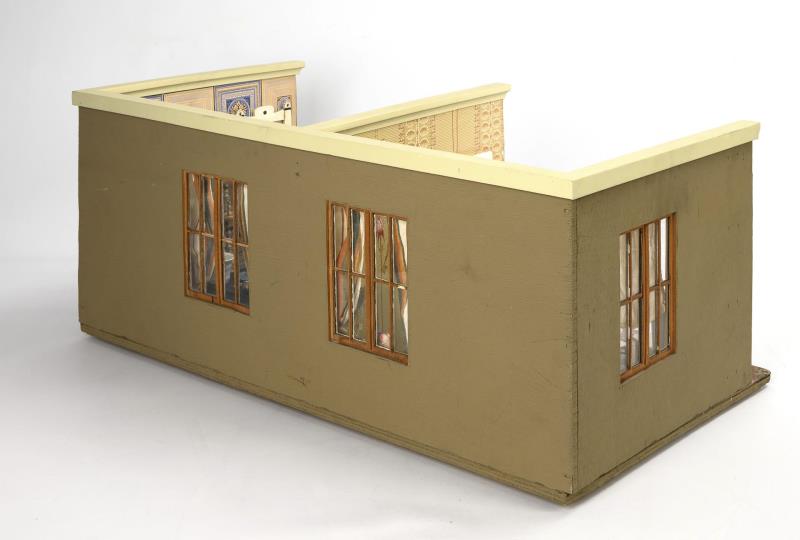 Case with 3 glazed sash bar windows, curtains and white intermediate door. Designed as an eat-in kitchen: left room with kitchen buffet, table and chairs, right room with tin stove, light blue tiled stove made of plaster and 2 wall shelves. In addition 2 small dolls. Signs of age, small defects, partly reworked.