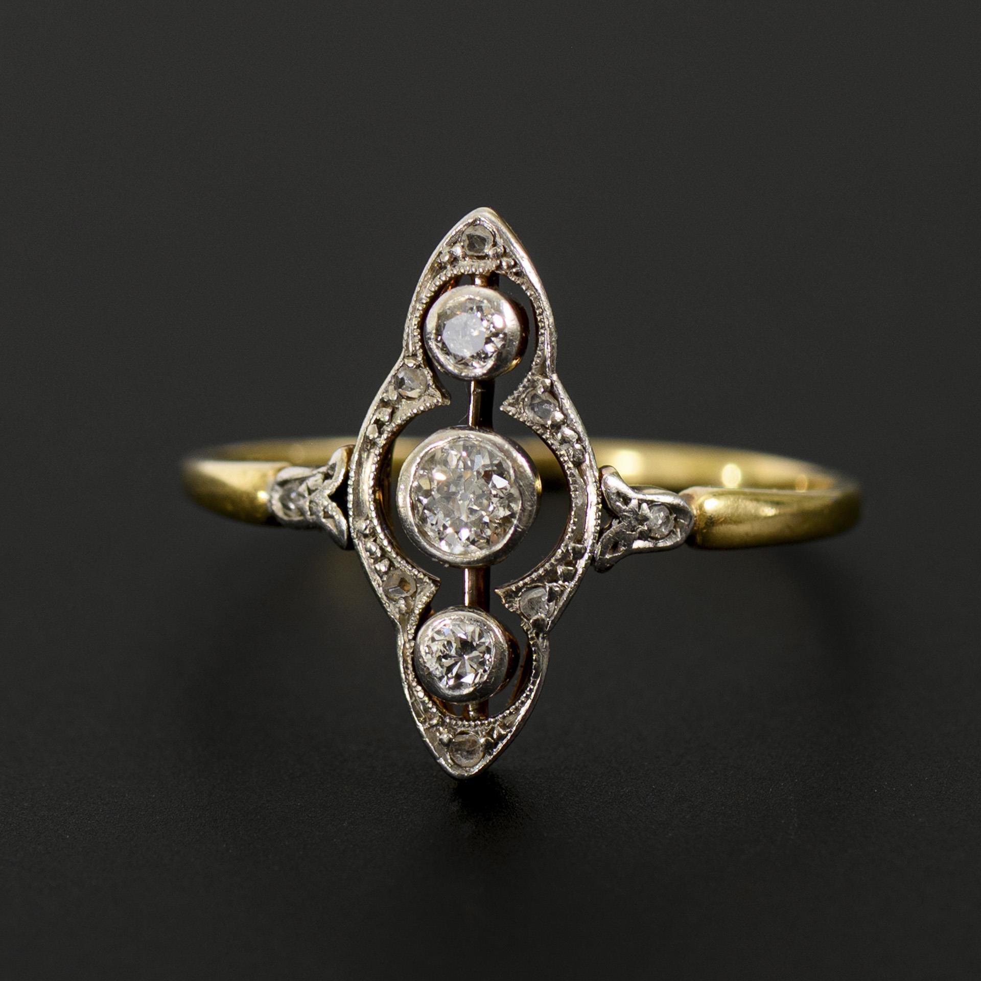 Navette or "boat-shaped" Art Deco ring in a delicate, light design with 3 bezel-set old-cut diamonds and further small diamonds in the millegrain-decorated ring head.