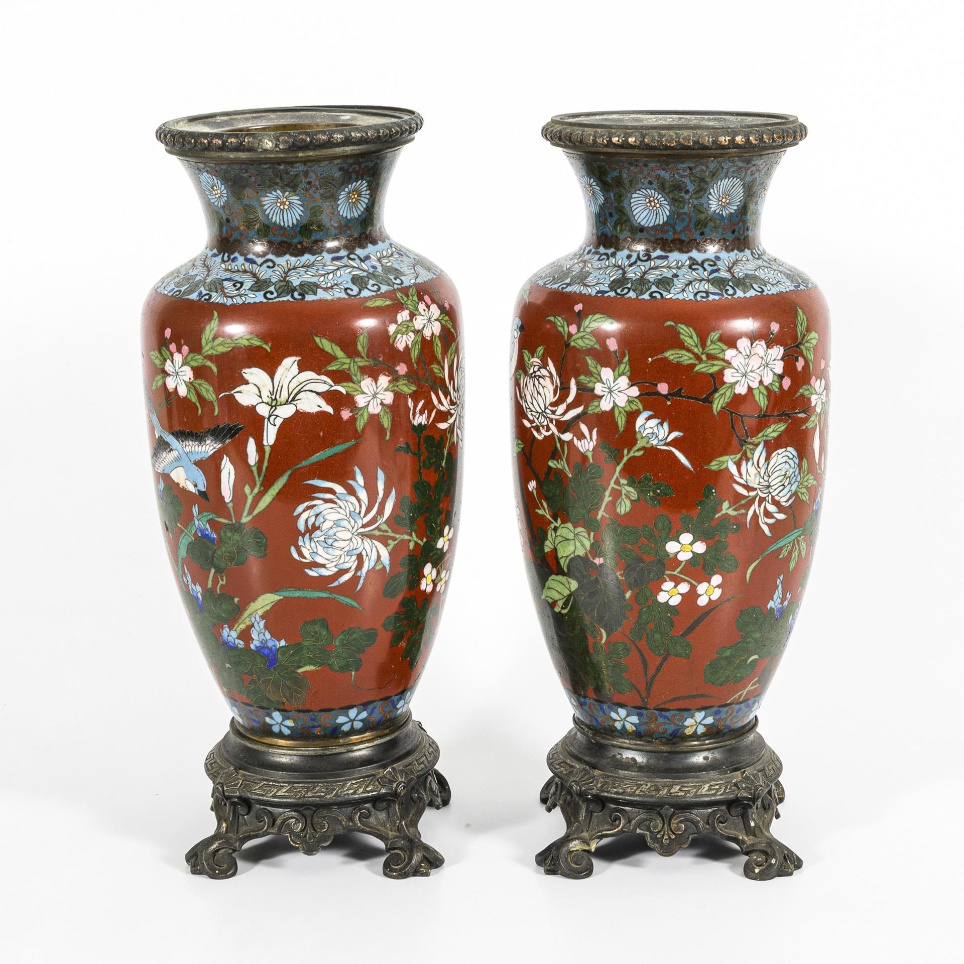 Pair of vases with metal mounts.